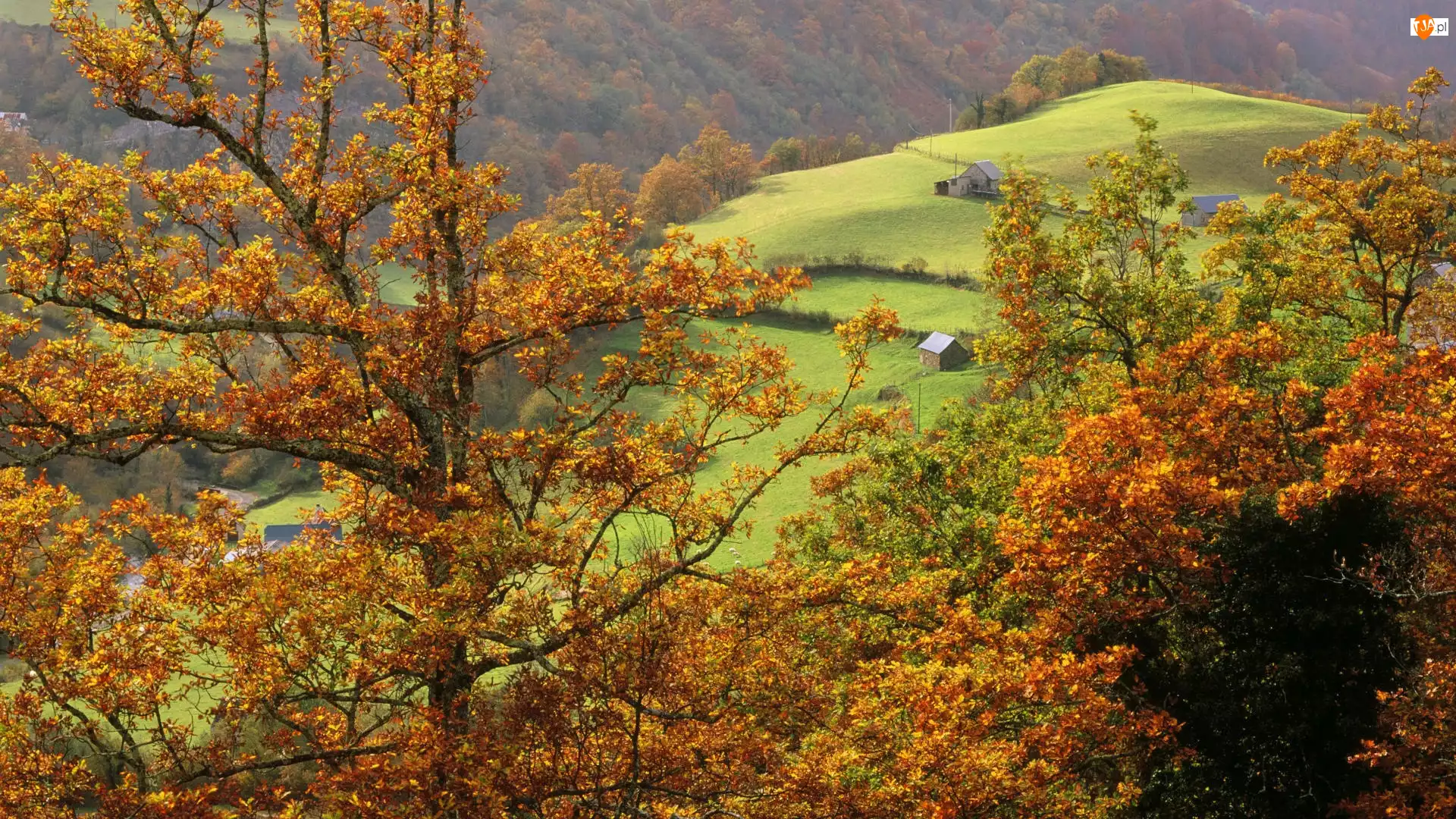 Małe, Żółte, Zbocza, Drzewa, Gór, Domki