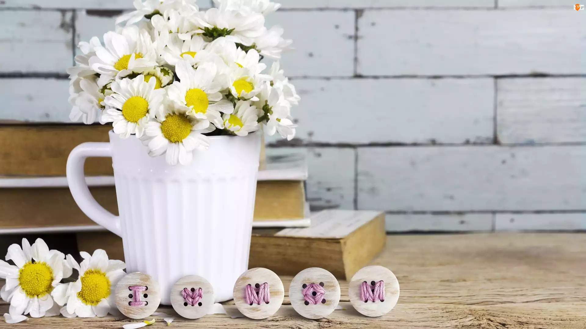 Napis, Kubek, Książki, I love Mom, Kwiaty, Guziczki, Dzień Matki, Margerytki