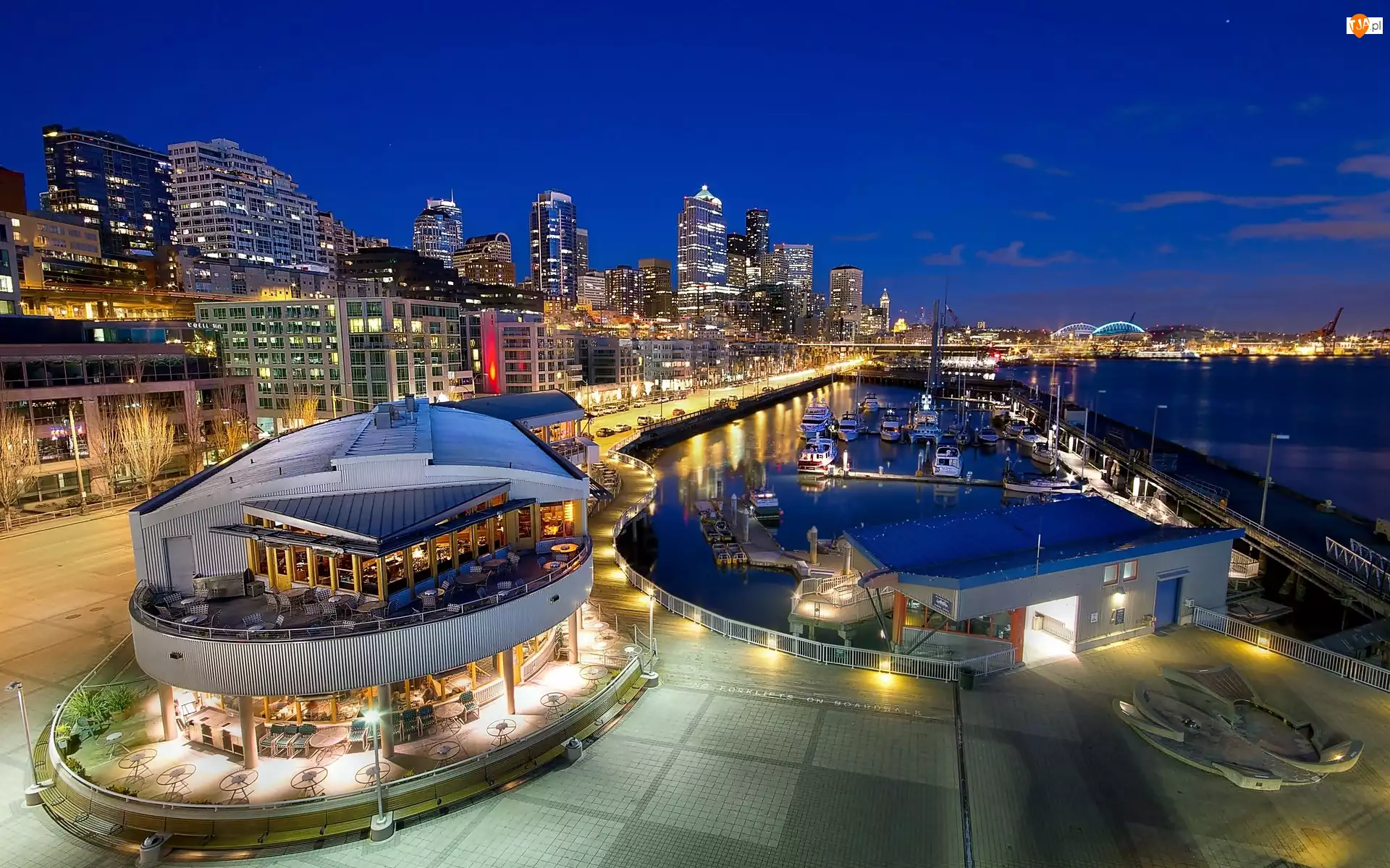 Marina, Nabrzeże, Seattle, Restauracja, Nocą, Ja
