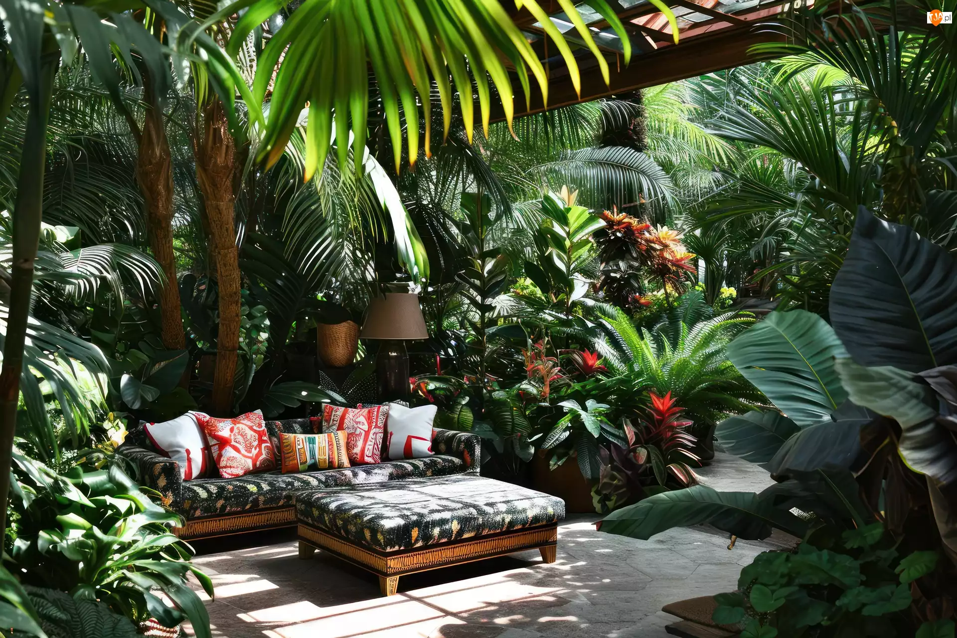 Palmy, Kącik wypoczynkowy, Kwiaty, Ogród, Meble