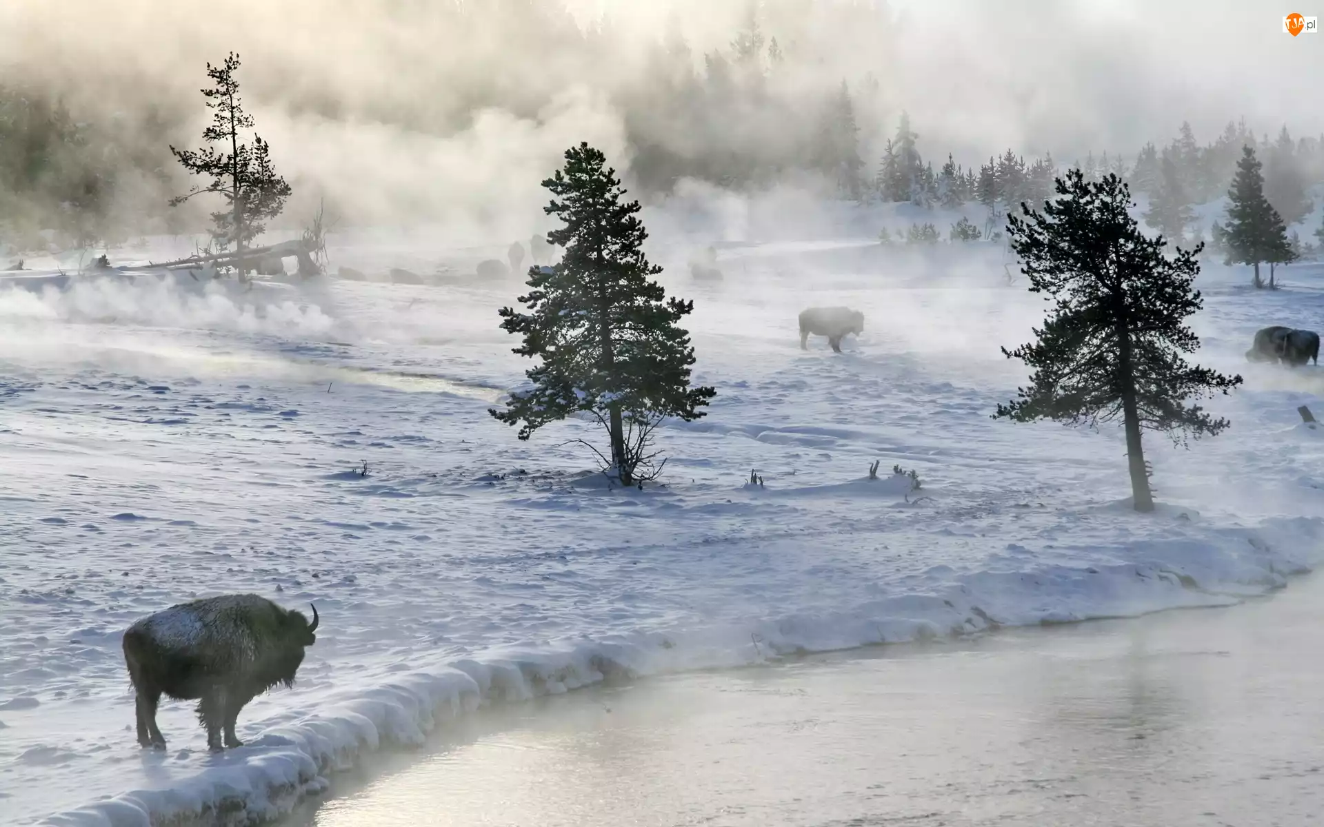 Mgła, Bizony, Drzewa, Rzeka, Śnieg