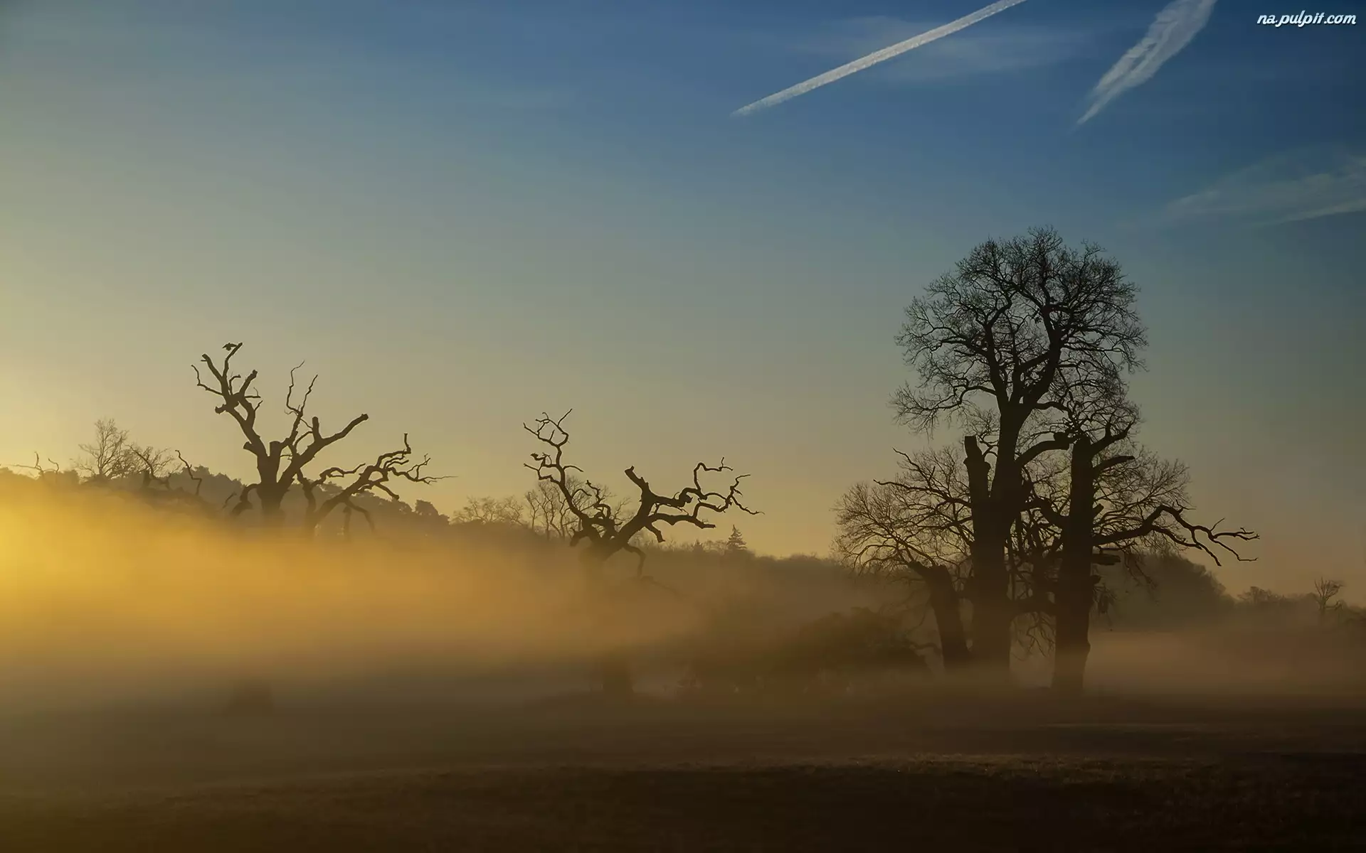 Mgła, Dęby, Poranek, Rogalin, Wschód słońca, Drzewa