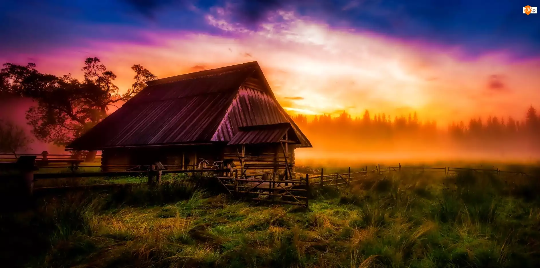 Mgła, Dom, Zachód, Trawa, Słońca, Ogrodzenie