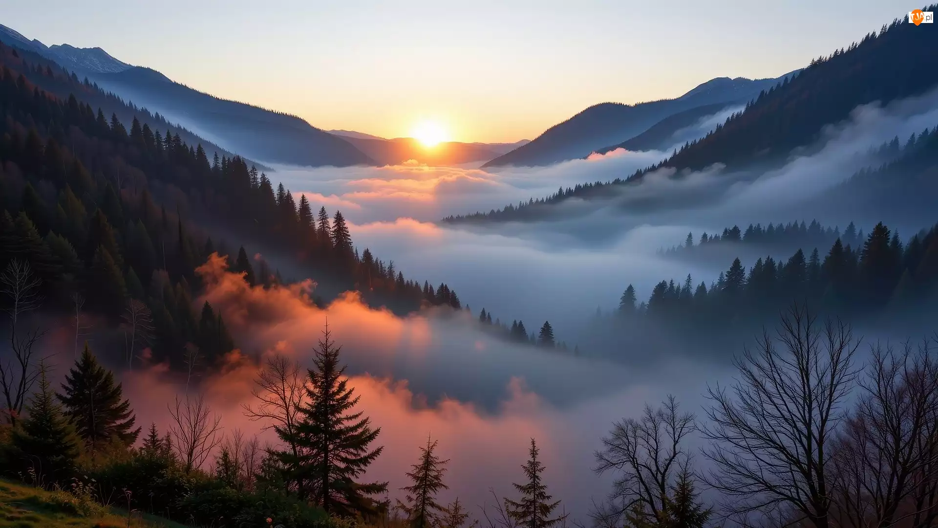 Tagi: Mgła Drzewa Opadająca Góry Słońce