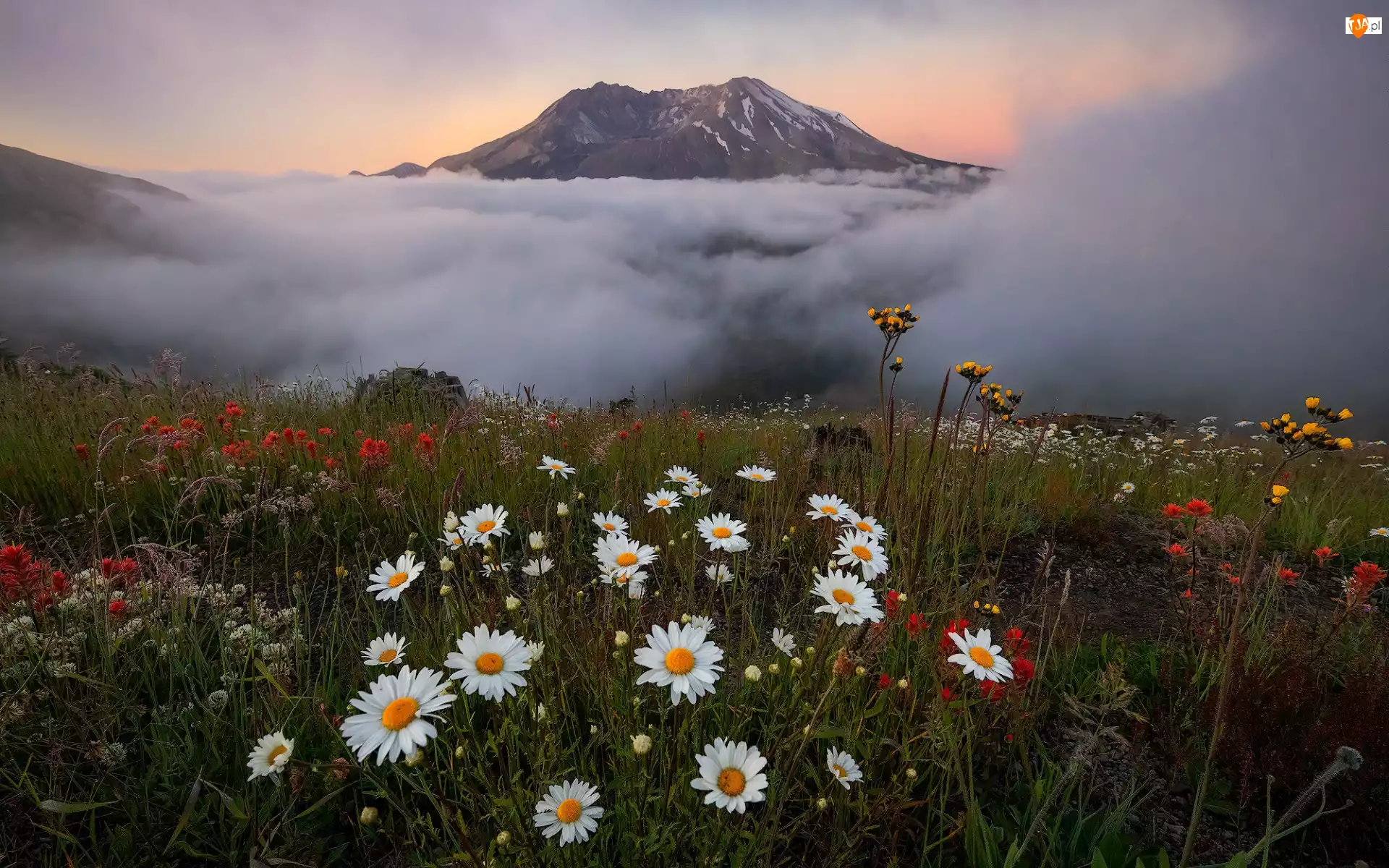 Mgła, Góry, Kwiaty, Trawa, Łąka, Margerytki