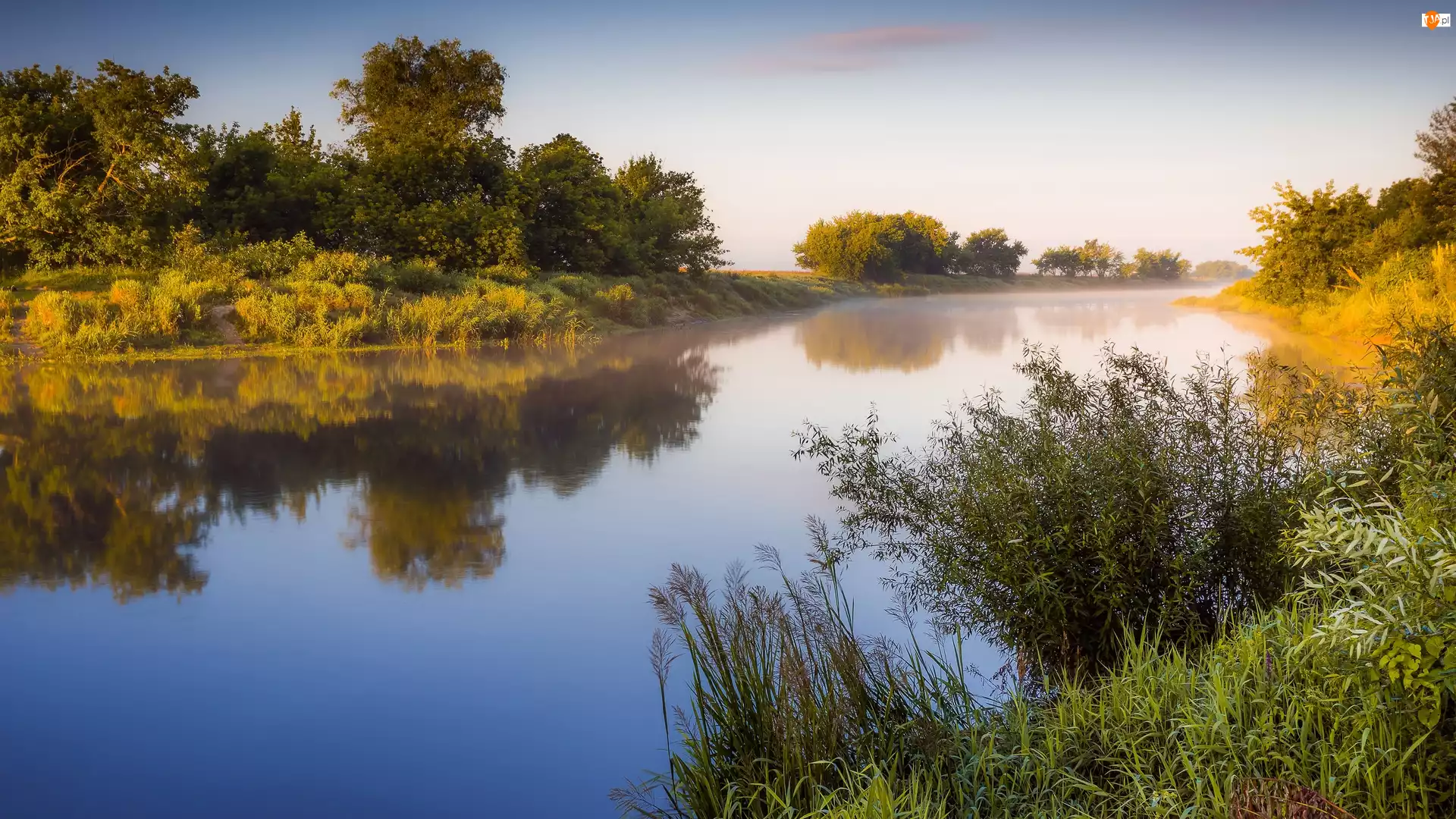 Mgła, Rzeka, Drzewa, Trawa, Wschód słońca, Krz