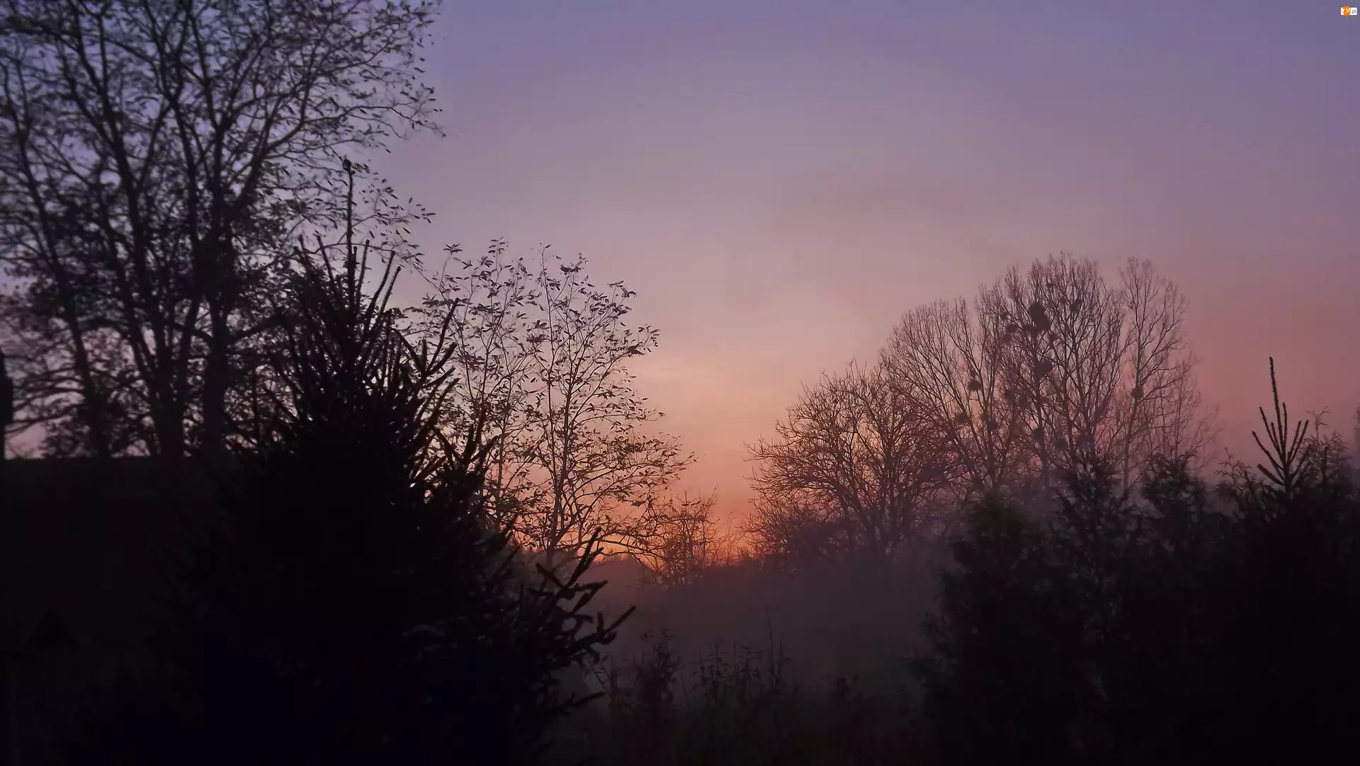Mgła, Słońca, Drzewa, Zachód