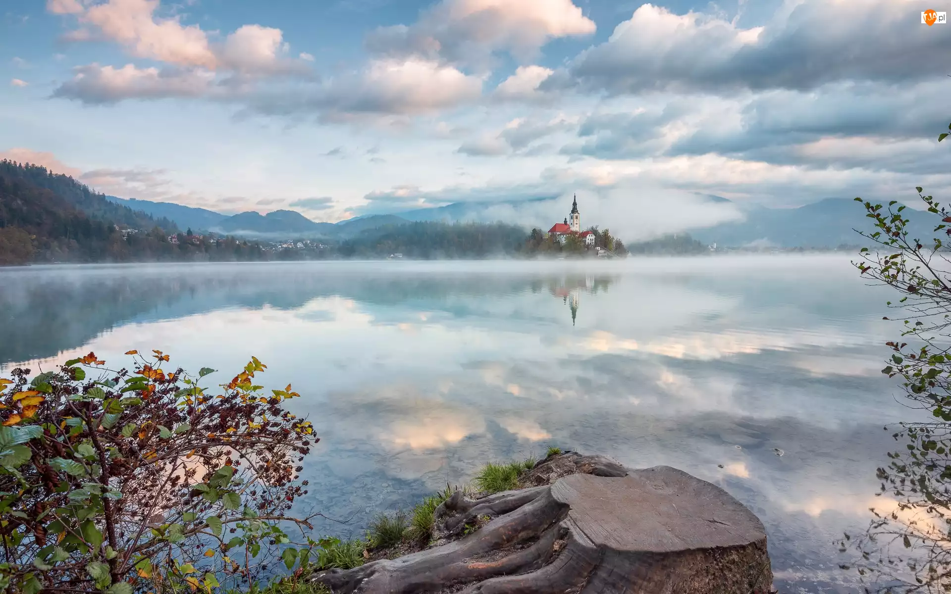 Mgła, Słowenia, Jezioro Bled, Chmury, Góry, Kościół Wniebowzięcia Marii Panny, Odbicie, Wyspa Blejski Otok
