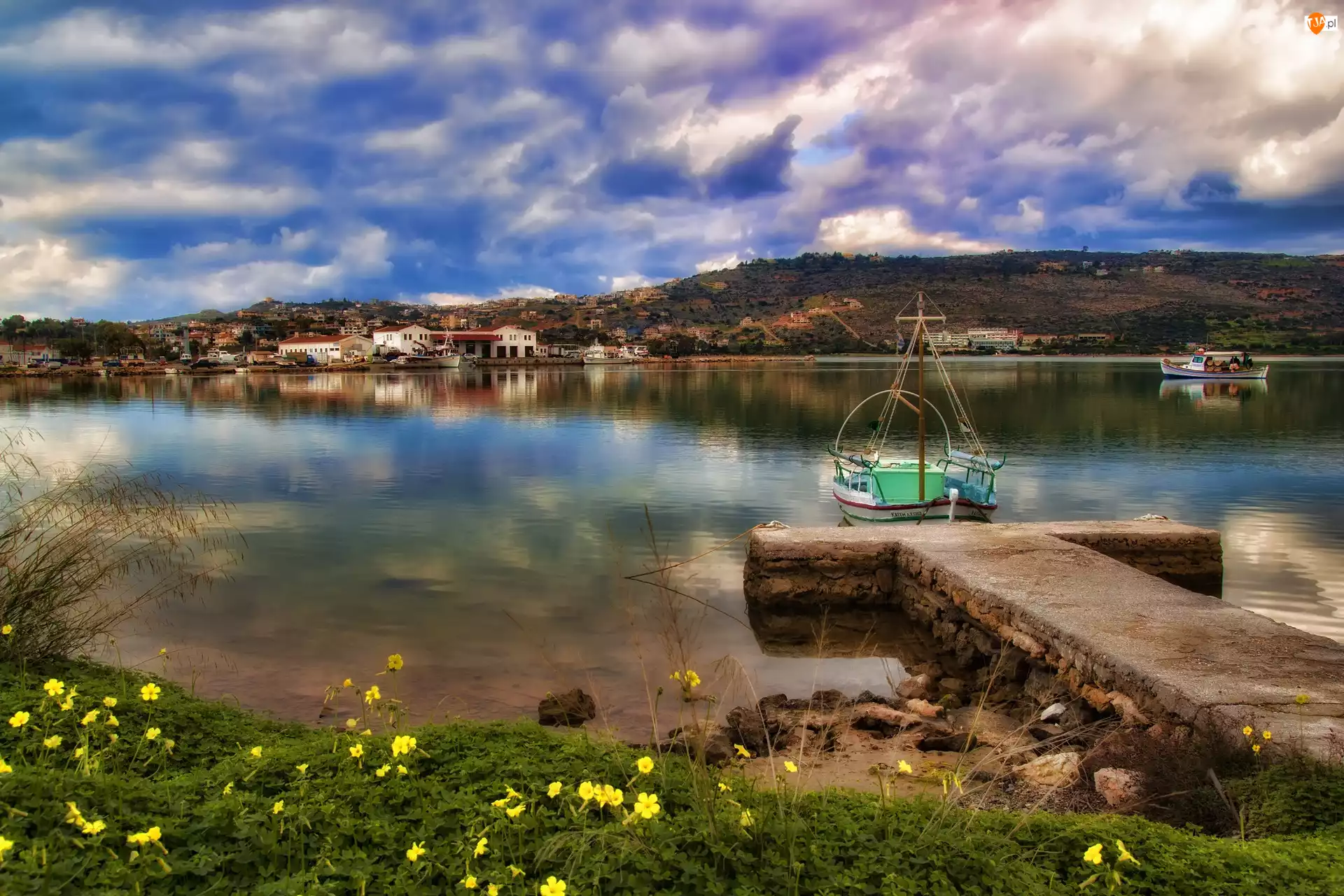 Miasta, Jezioro, Łodzie, Góry, Panorama