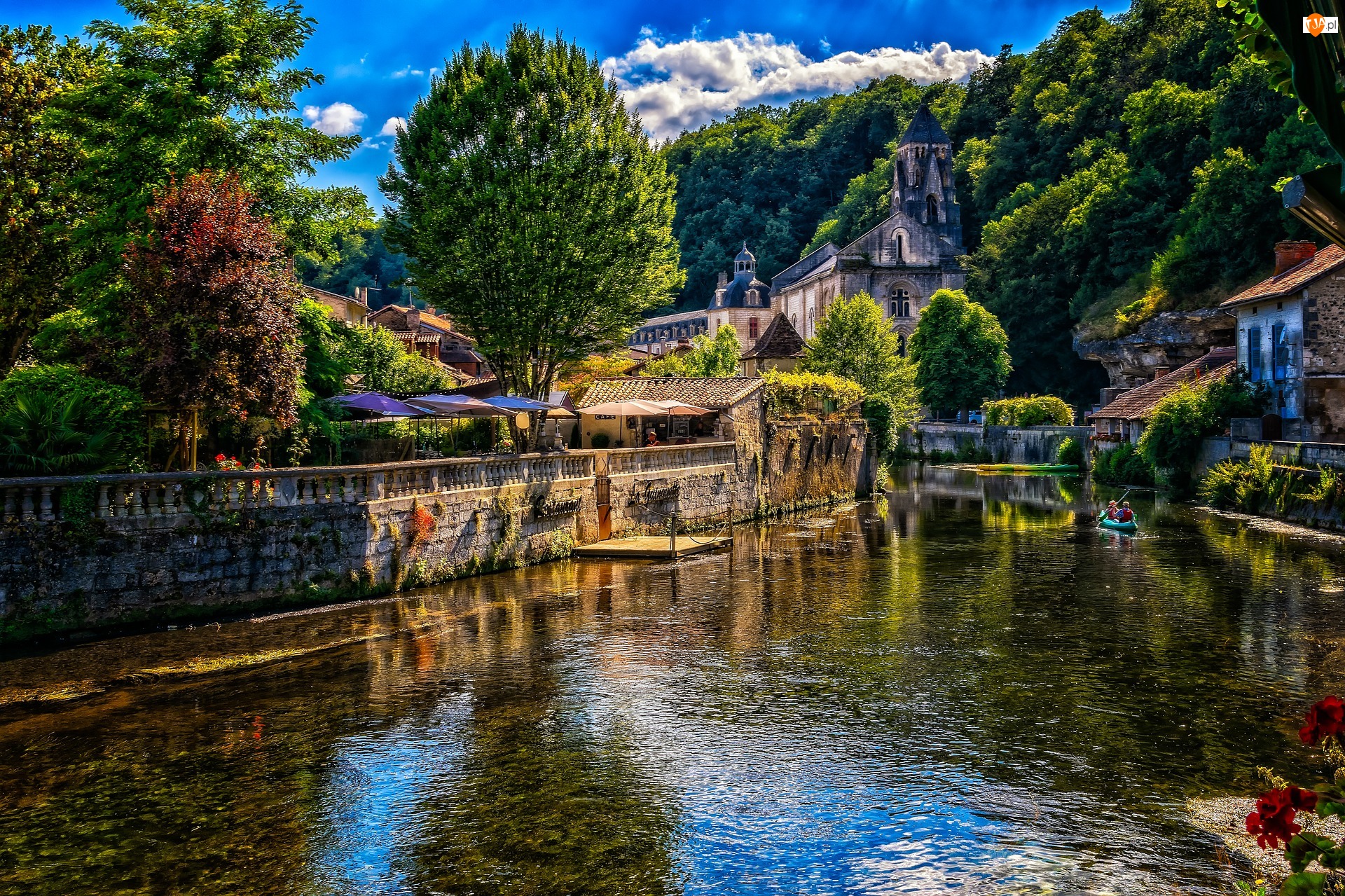 Francja, Miasto Brantome, Domy, Kajak, Rzeka, Roślinność