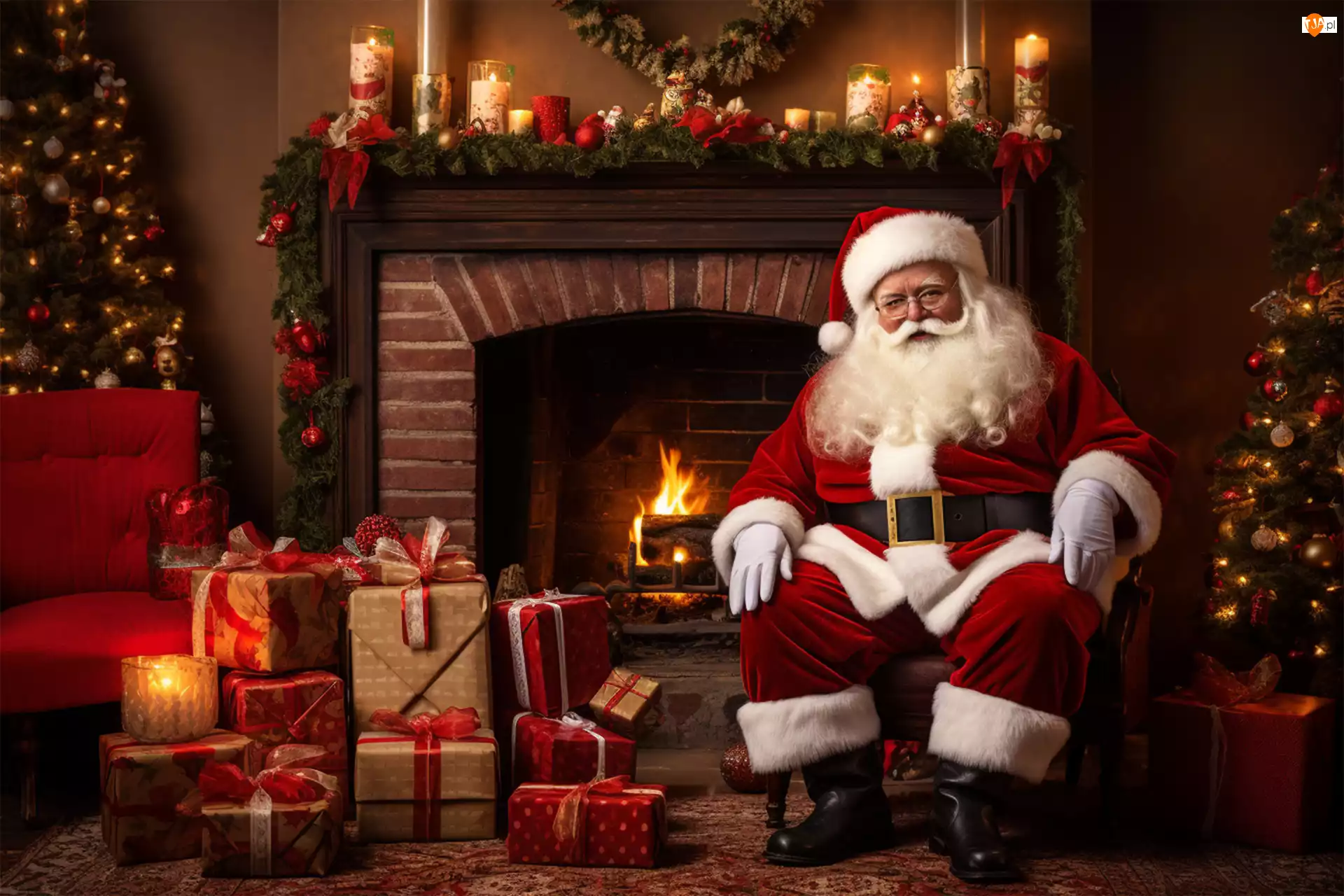 Mikołaj i prezenty przy kominkiem