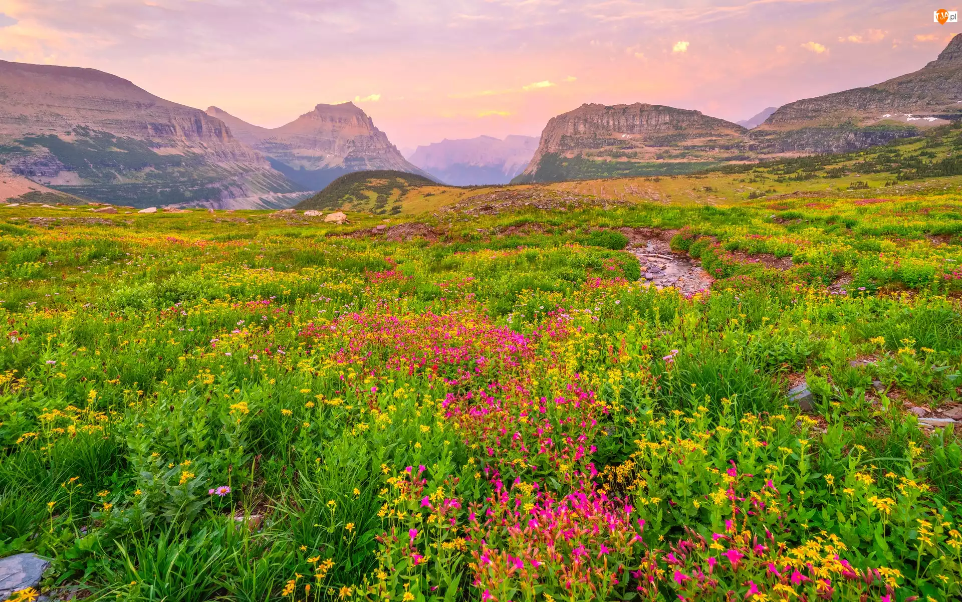 Montana, Park Narodowy Glacier, Polne, Stany Zjednoczone, Kwiaty, Łąka, Góry