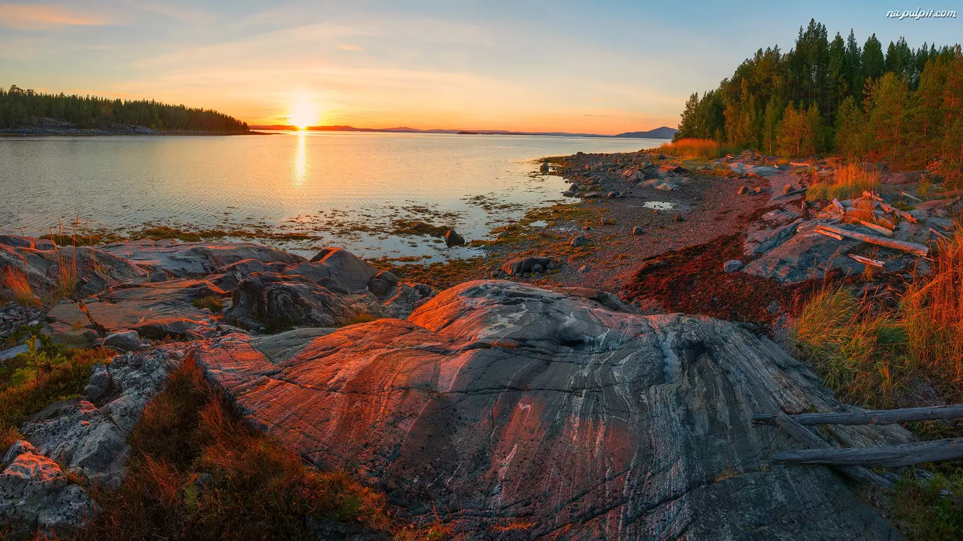 Rezerwat przyrody Kandalaksha, Morze Białe, Skała, Zachód słońca, Karelia, Las, Wyspa Ryazhkov, Rosja, Wybrzeże, Obwód murmański, Drzewa