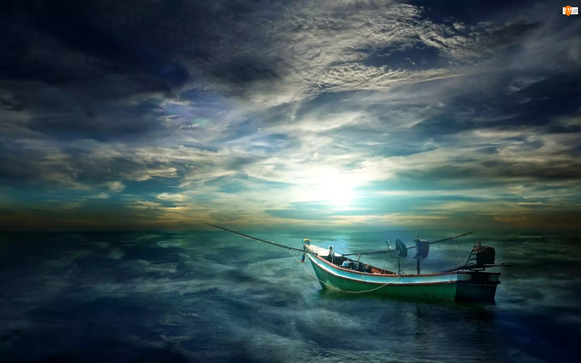 Morze, Ciemne, Łódka, Chmury, Wędki, Fale