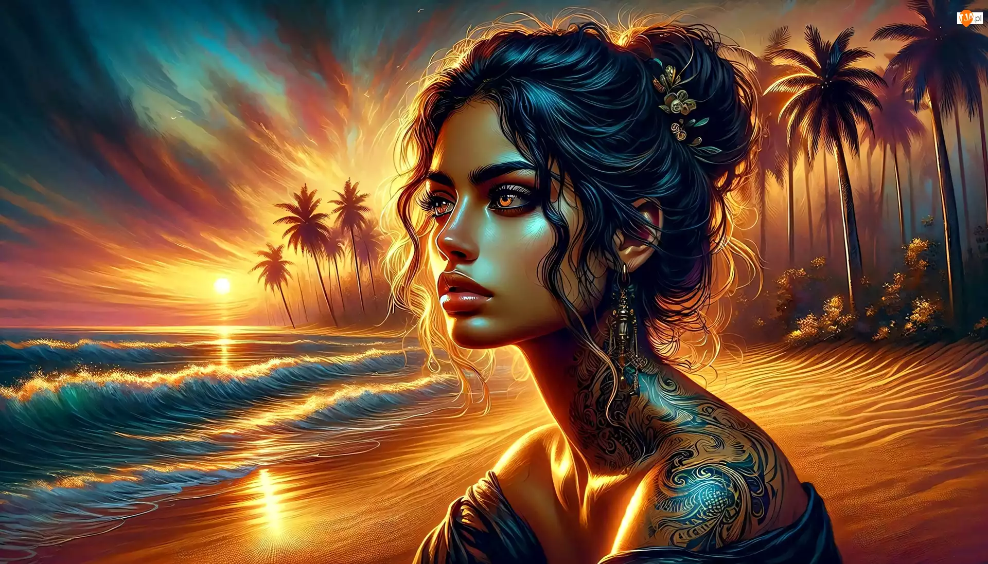 Morze, Grafika, Plaża, Kobieta, Zachód słońca