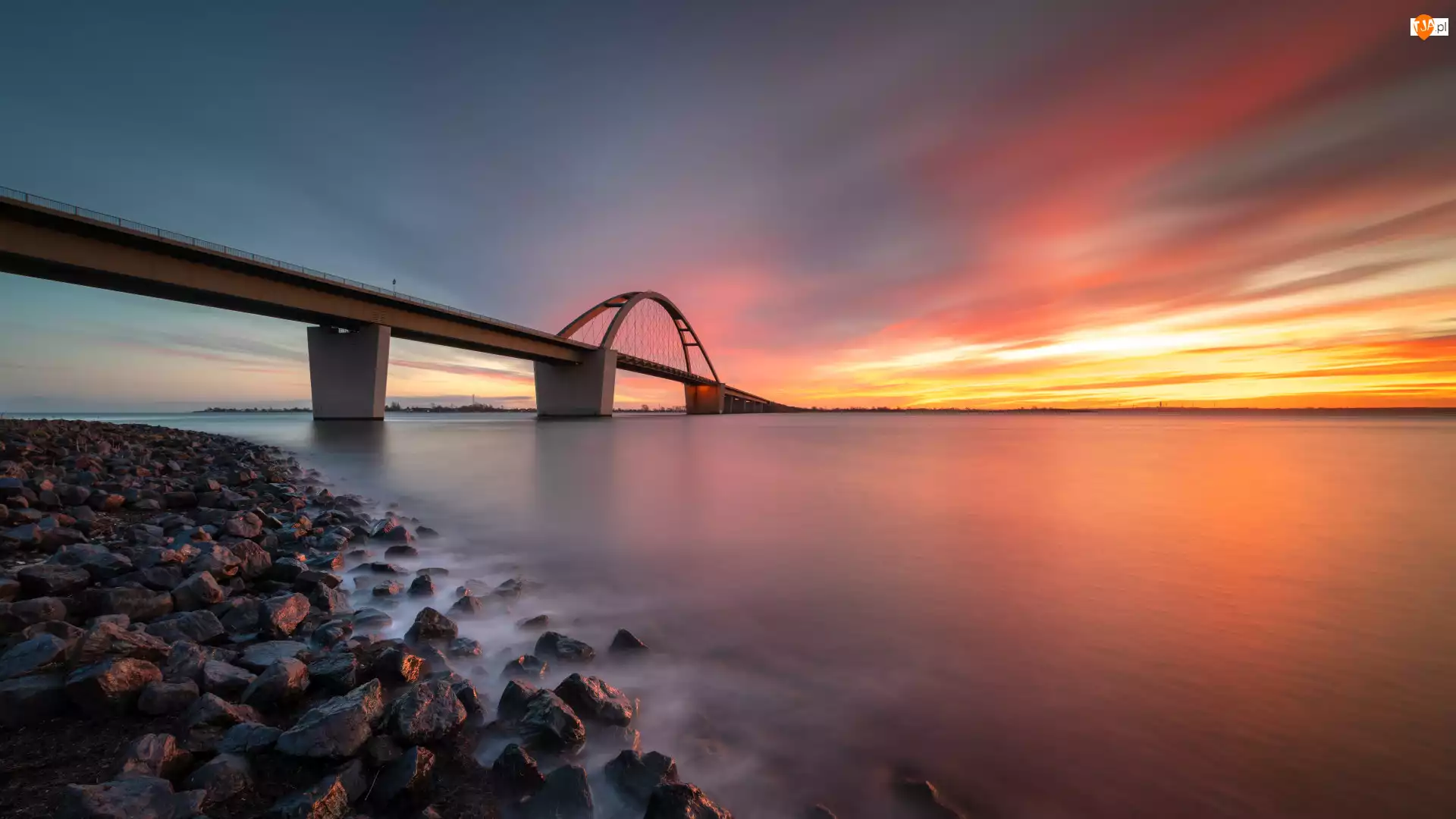 Most Fehmarnsund, Wyspa Fehmarn, Niemcy, Morze Bałtyckie, Wschód słońca, Kamienie, Brzeg
