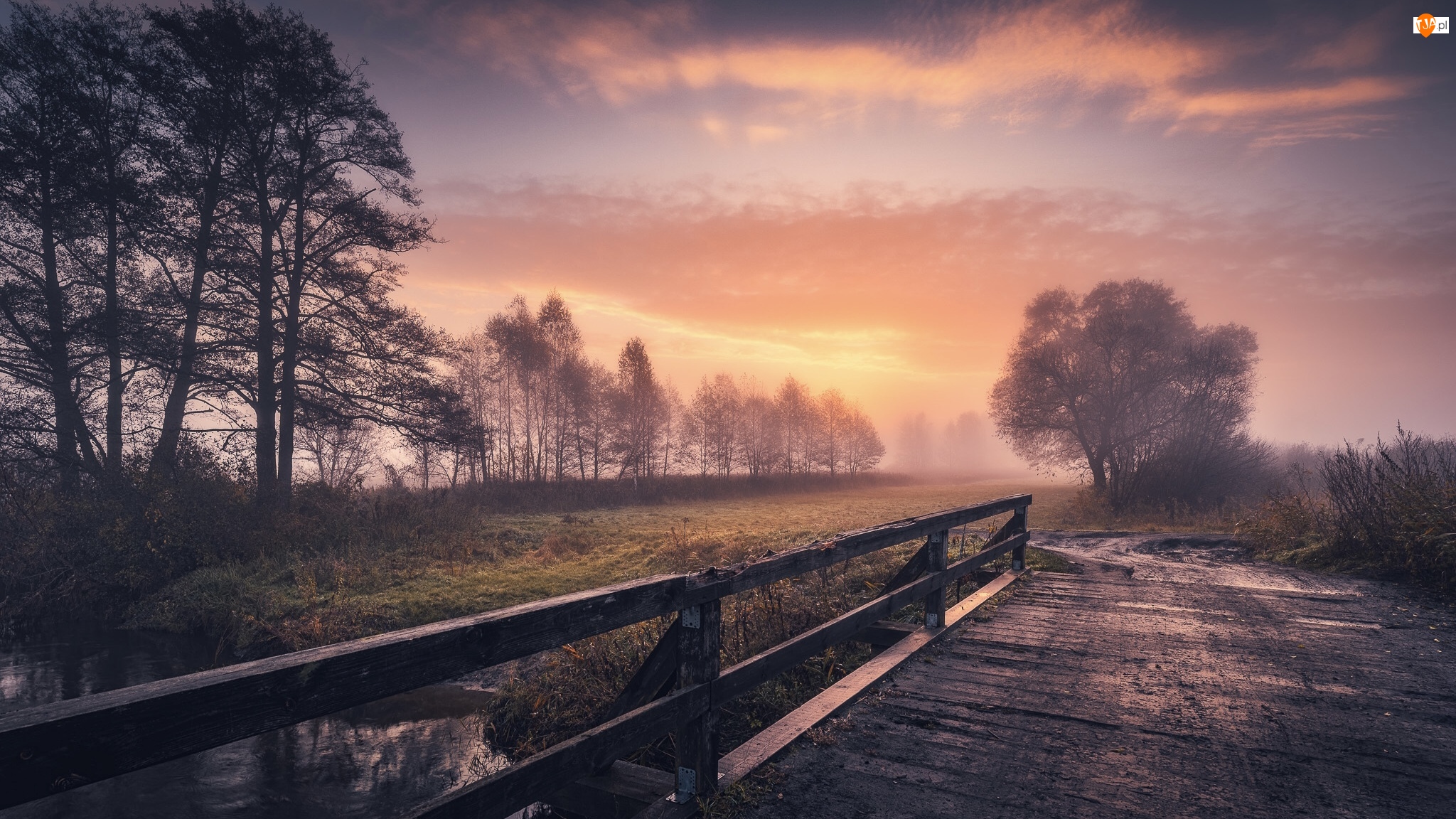 Most, Mgła, Rzeka, Zachód słońca, Drzewa