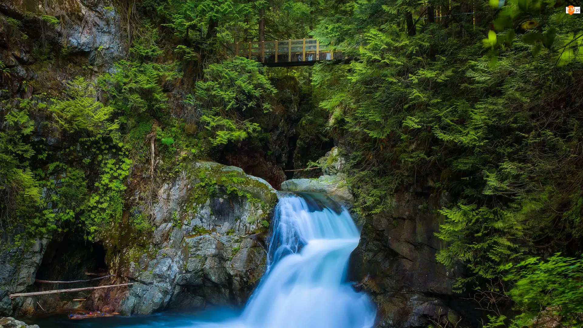 Drzewa, Twin Falls, Roślinność, Rzeka, Vancouver, Most, Kaskada, Kanada, Park, Lynn Canyon Park, Skały