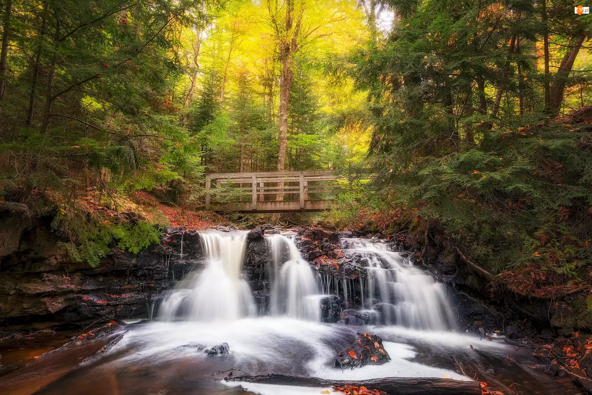 Miejscowość Munising, Las, Mostek, Stan Michigan, Wodospad Chapel Falls, Park Narodowy Pictured Rocks National Lakeshore, Stany Zjednoczone, Jesień