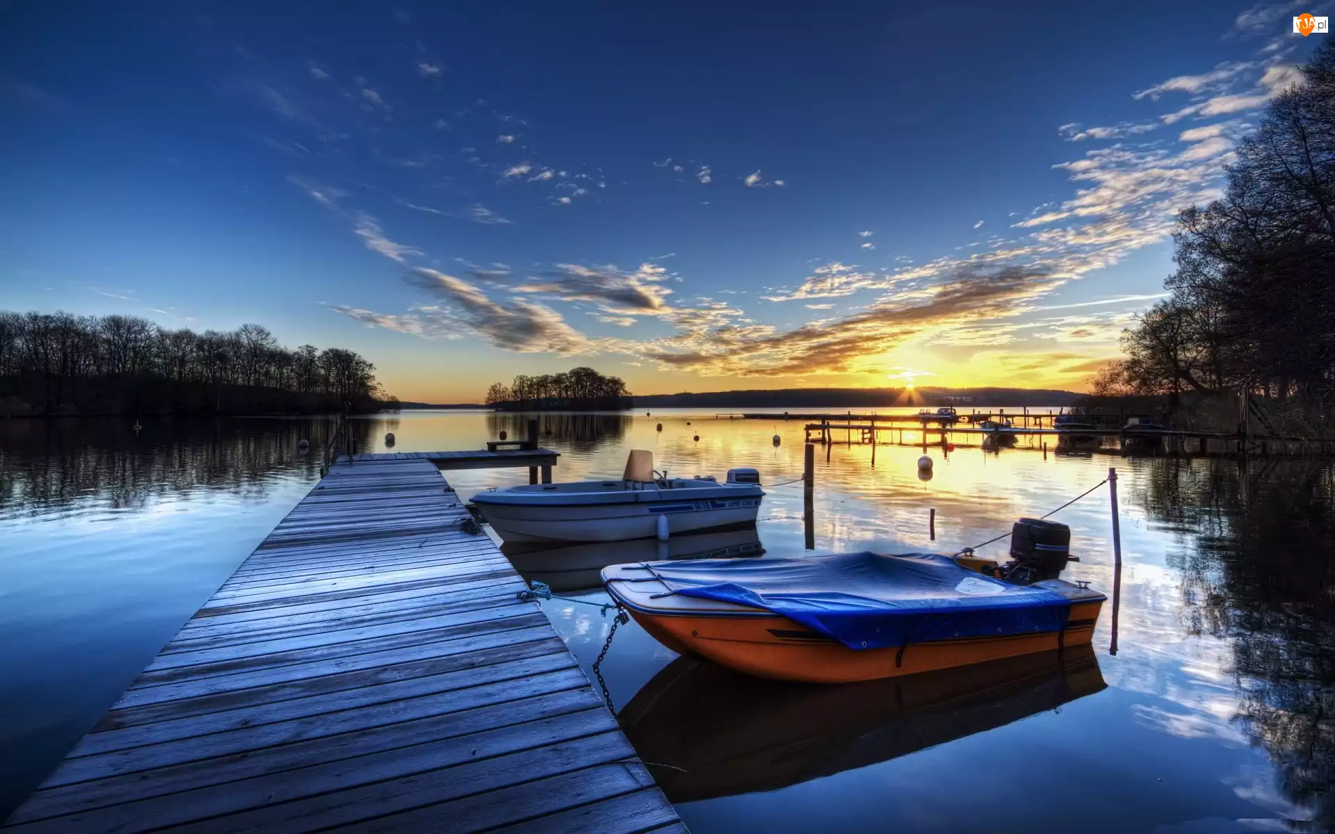 Motorówki, Jezioro, Słońca, Wschód, Pomost