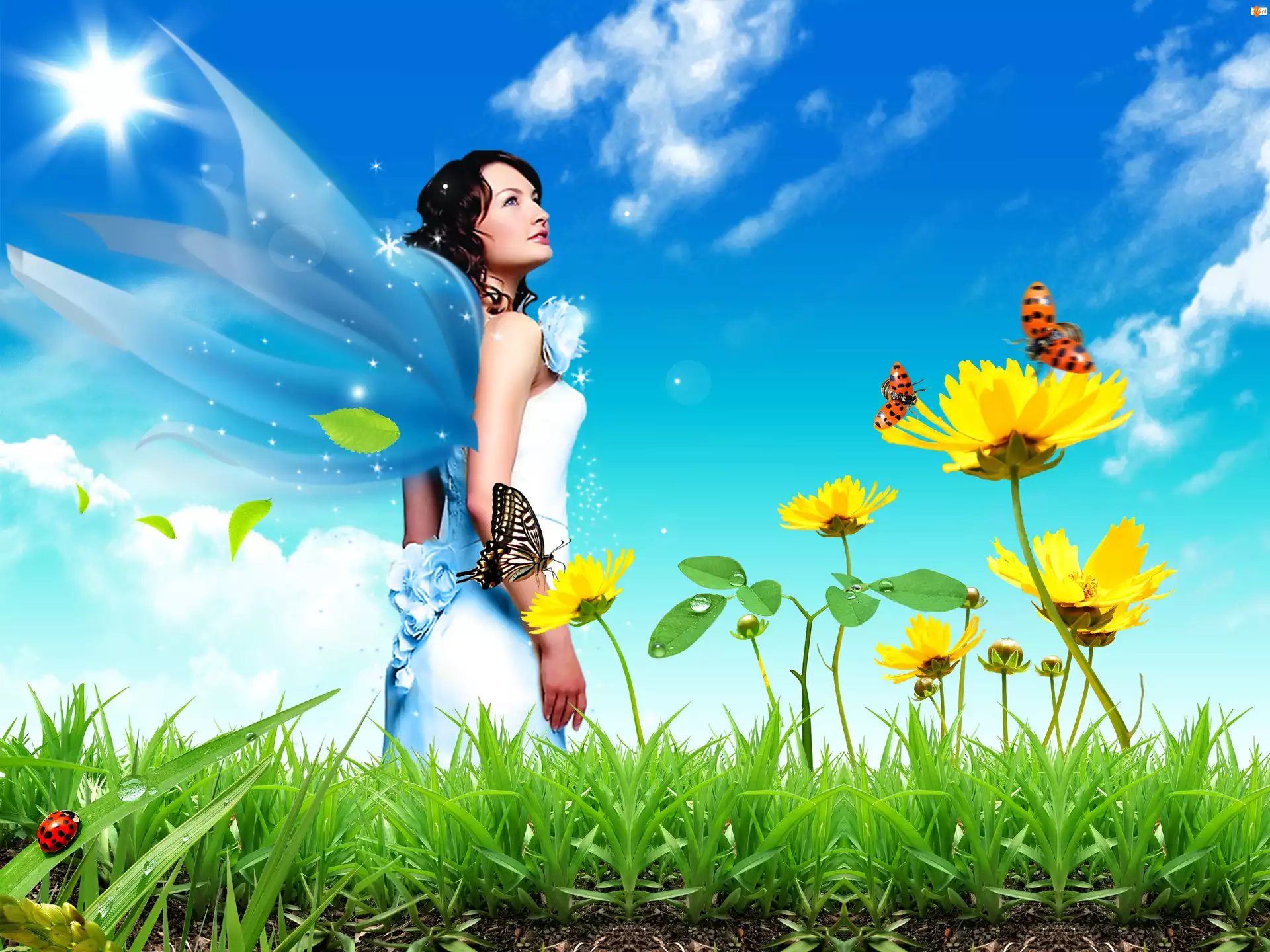 Motyle, Trawa, Elf, Niebo, Kobieta, Kwiaty