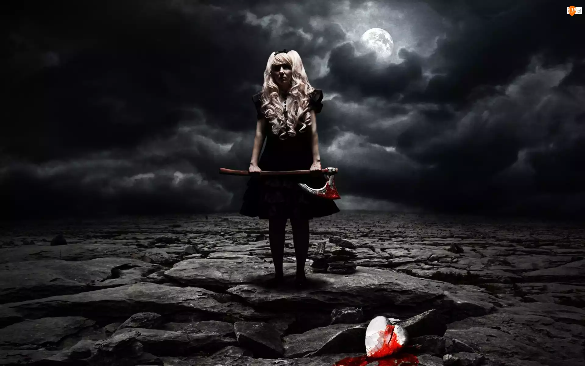 Mrok, Krew, Topór, kobieta, Chmury, Księżyc, Serce