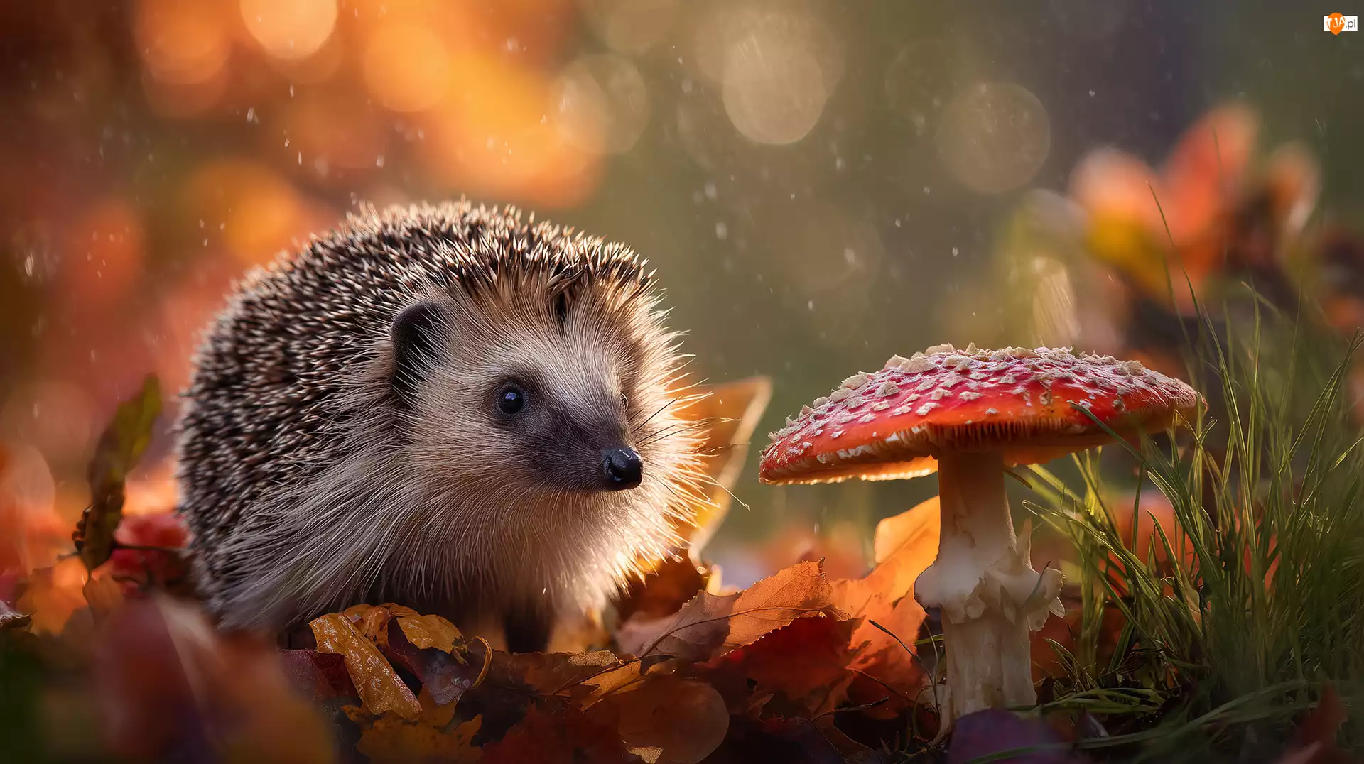 Muchomor, Czerwony, Grafika AI, Jeż, Liście, Jesienne, Grzyb