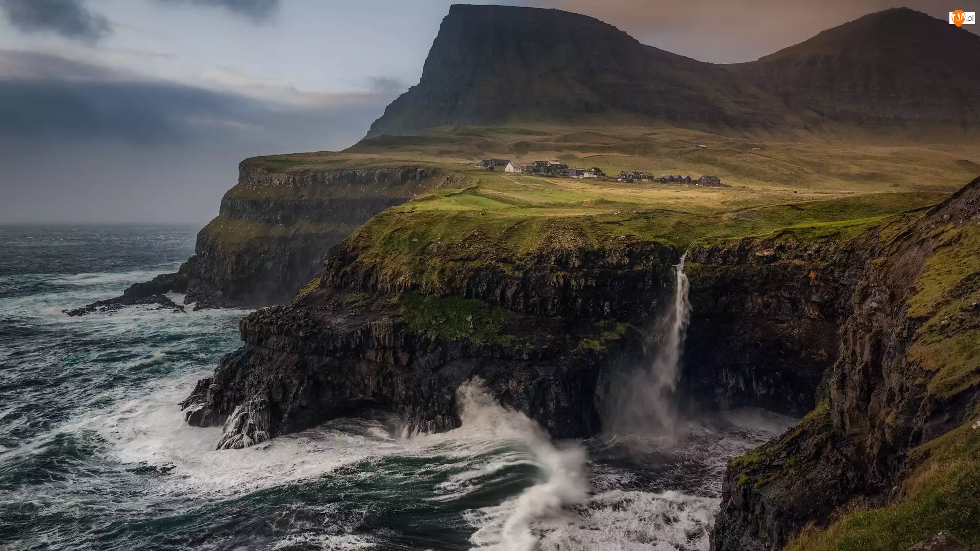 Mulafossur Waterfall, Wyspy Owcze, Wodospad, Chmury, Wioska, Dania, Góry, Fale, Wyspa Vagar, Klif, Morze, Domy