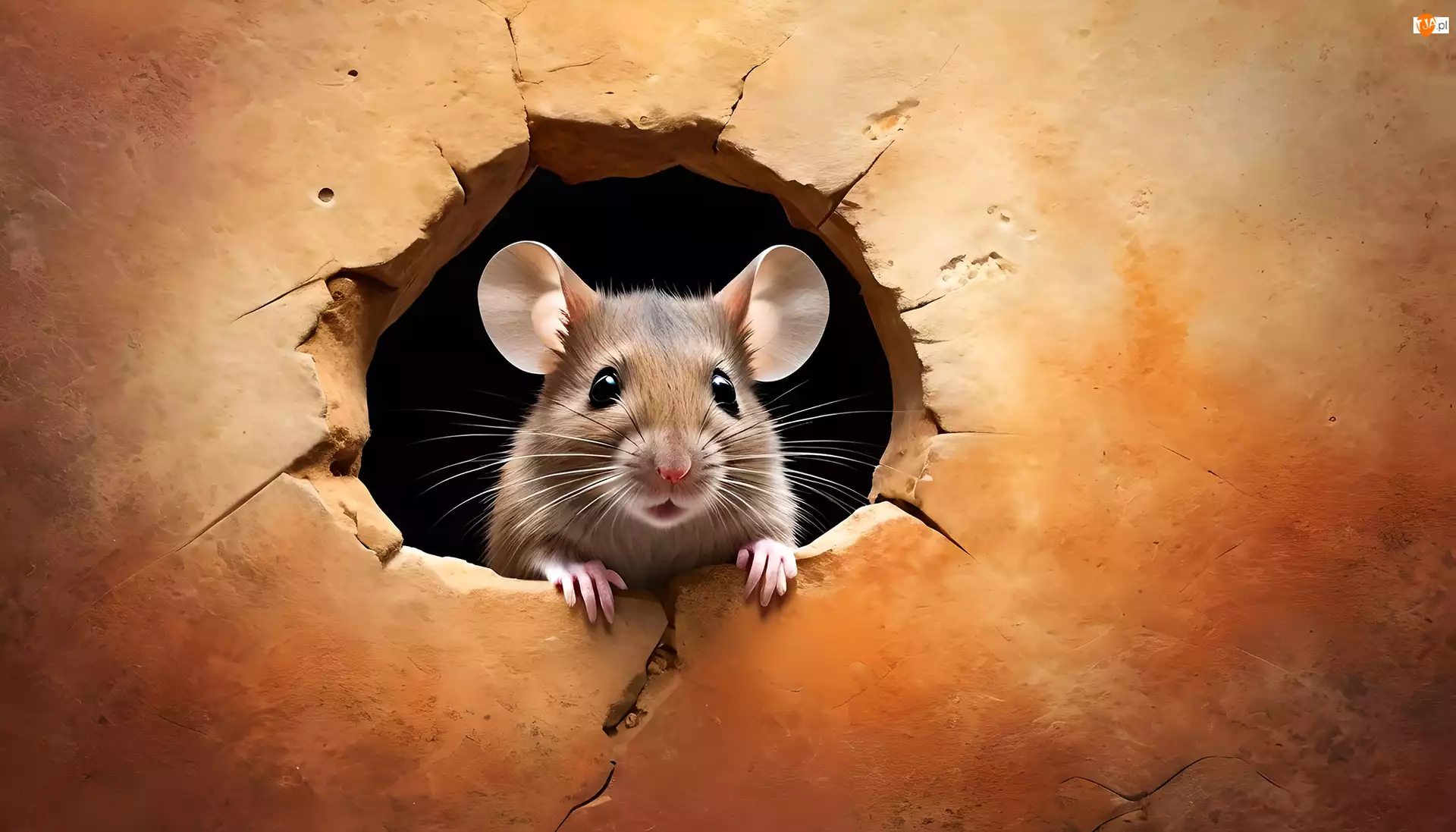 Mysz wyglądająca przez dziurę w ścianie