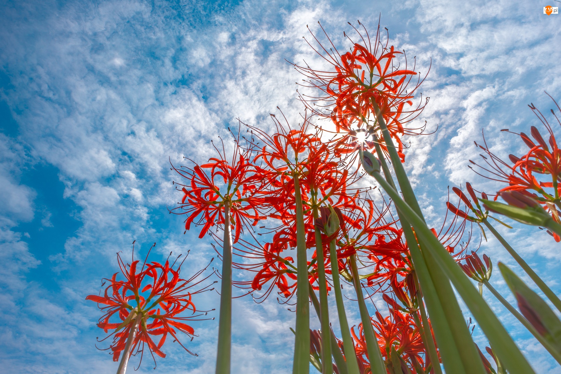 Lycoris, Chmury, Czerwona pajęcza lilia, Kwiaty, Niebo