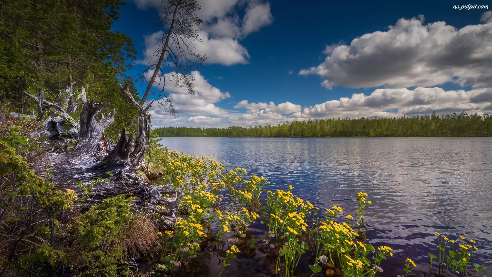 Kwiaty, Chmury, Kaczeńce, Region Kainuu, Jezioro, Finlandia, Żółte, Park Narodowy Hossa, Drzewa