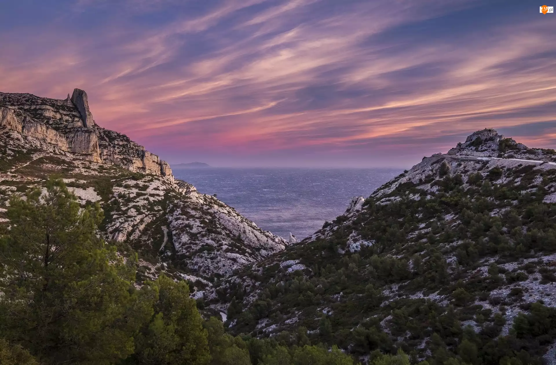 Skały wapienne, Morze, Drzewa, Góry, Francja, Marsylia, Park Narodowy Calanques