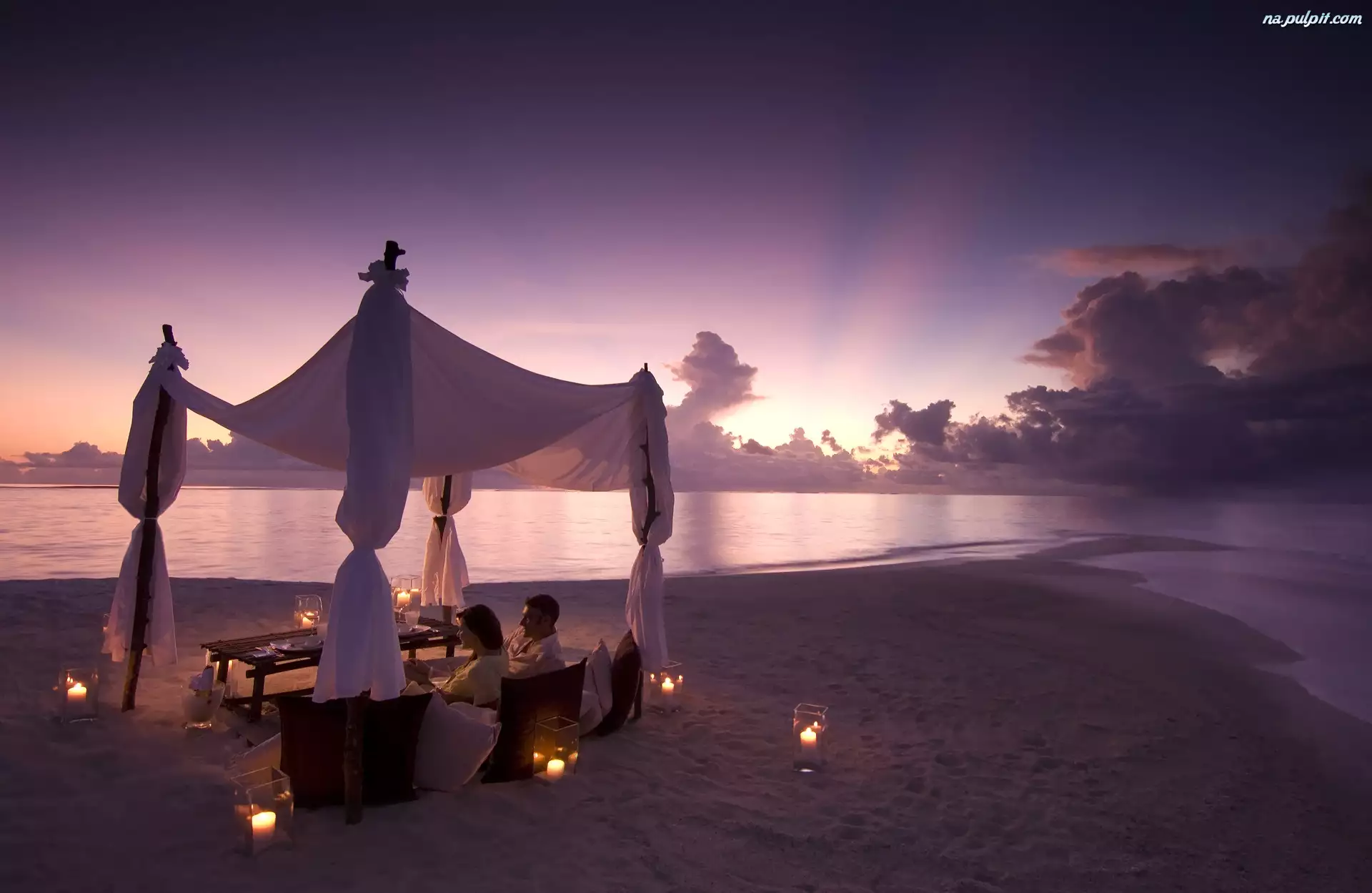 Morze, Para, Namiot, Plaża, Wakacje, Świece, Chmury, Romantycznie