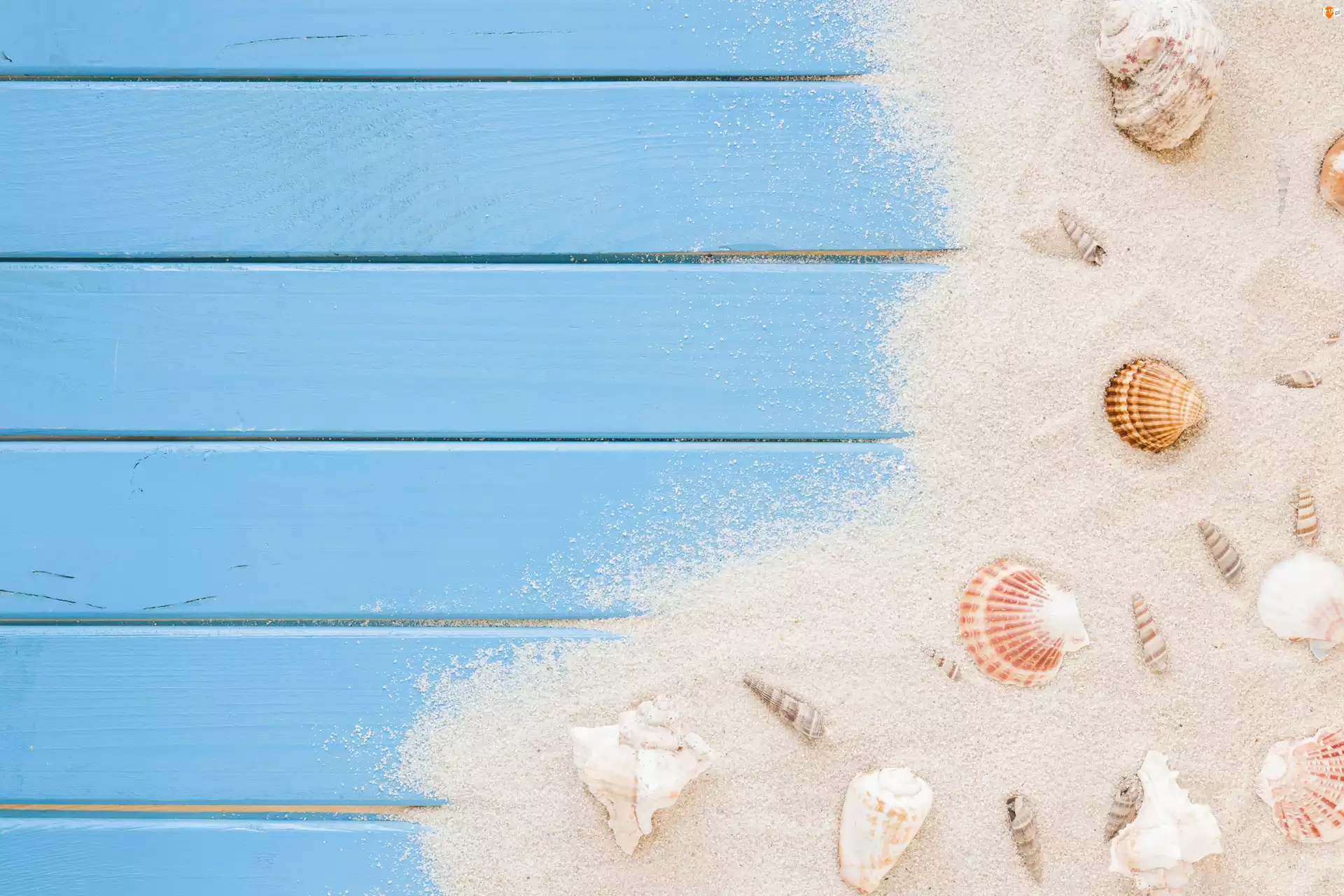 Niebieskie, Piasek, Muszelki, Deski