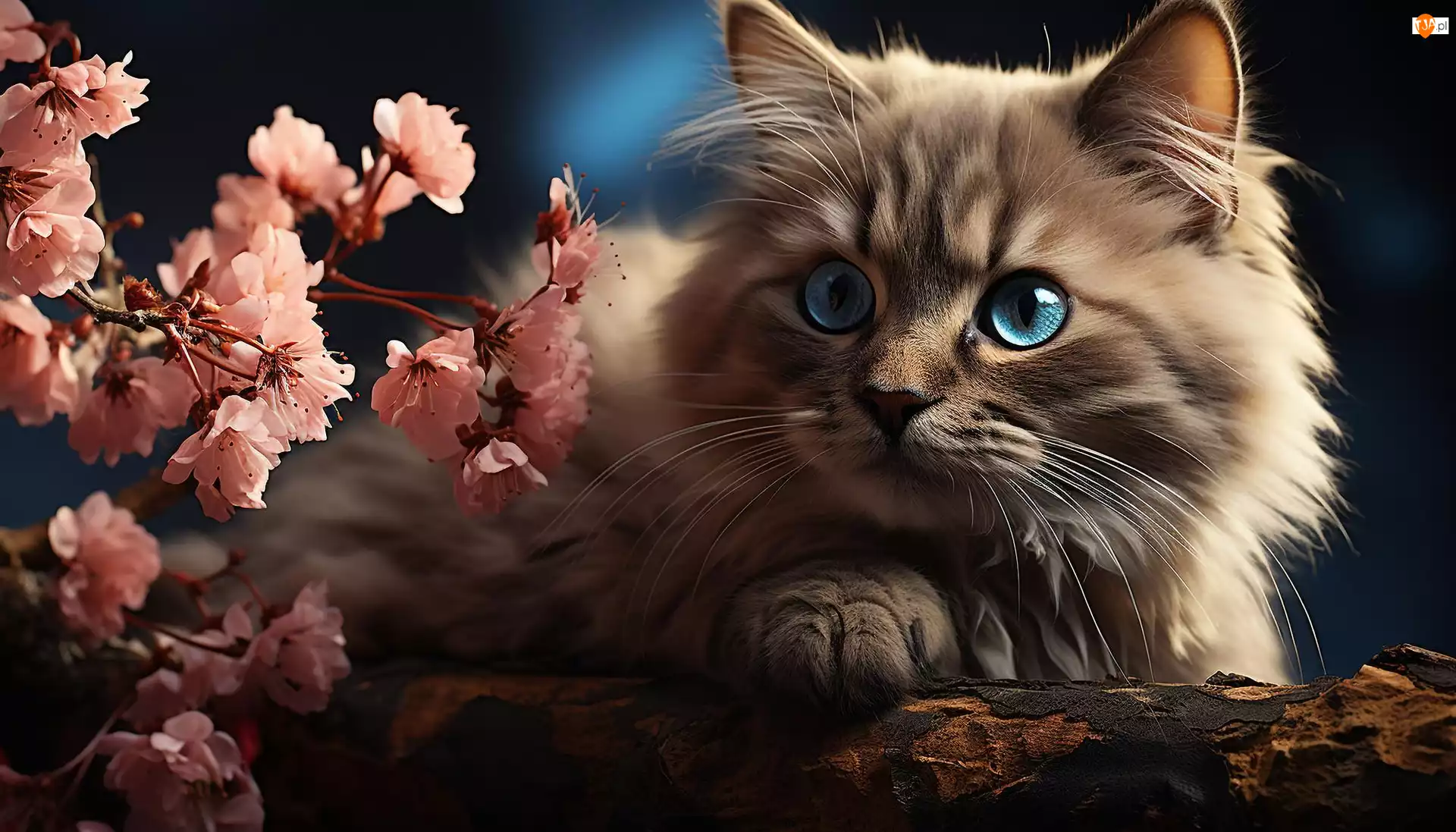 Kwiaty, Różowe, Niebieskooki, Kot, Gałązki