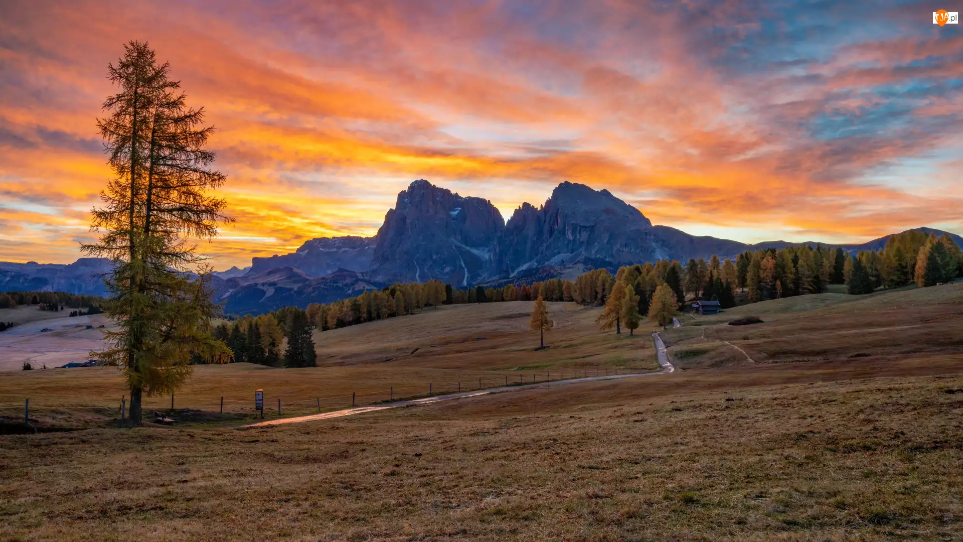 Niebo, Góry, Droga, Zachód słońca, Dolomity, Polana, Włochy, Drzewa
