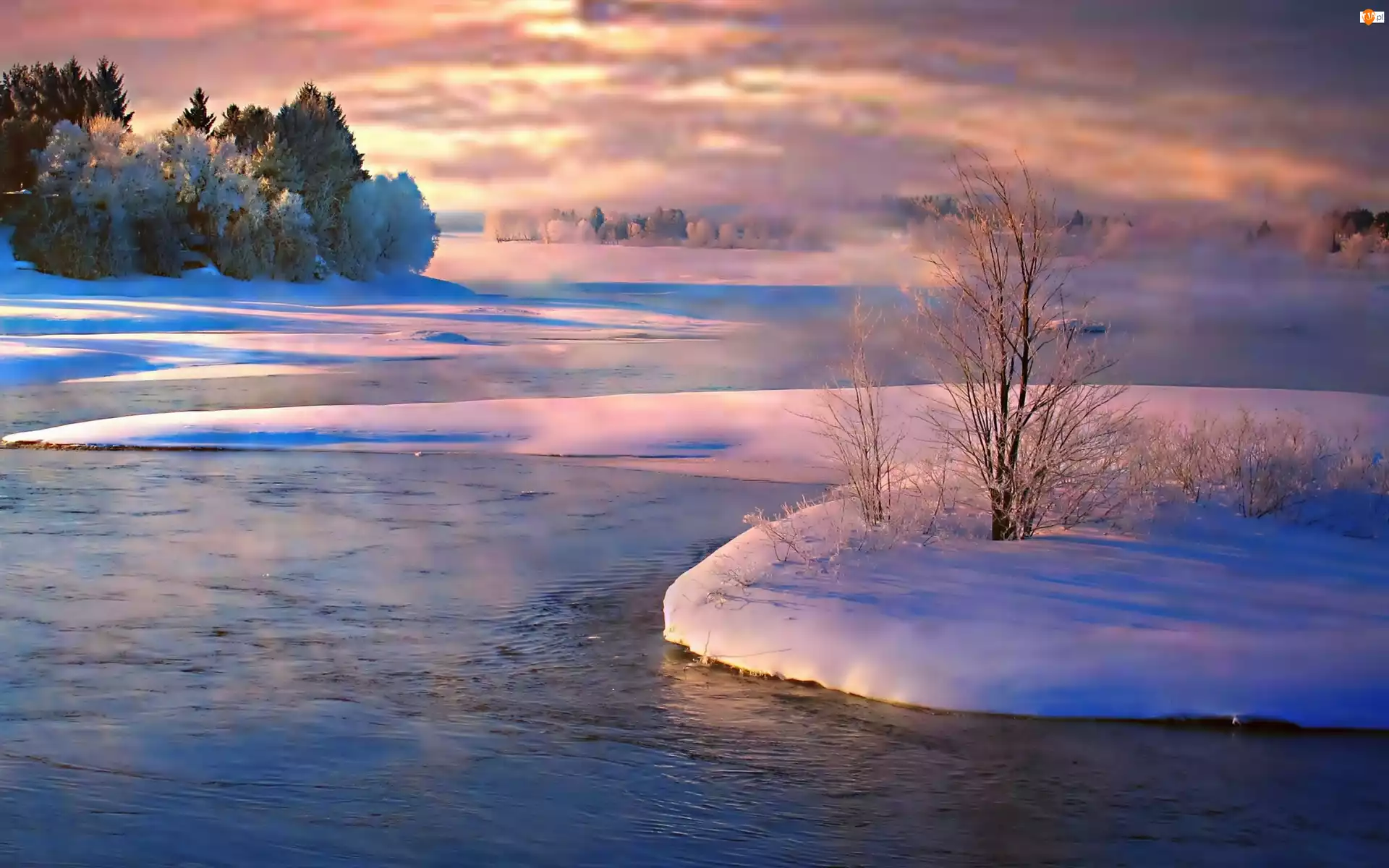 Niebo, Jezioro, Chmury, Drzewa, Różowe