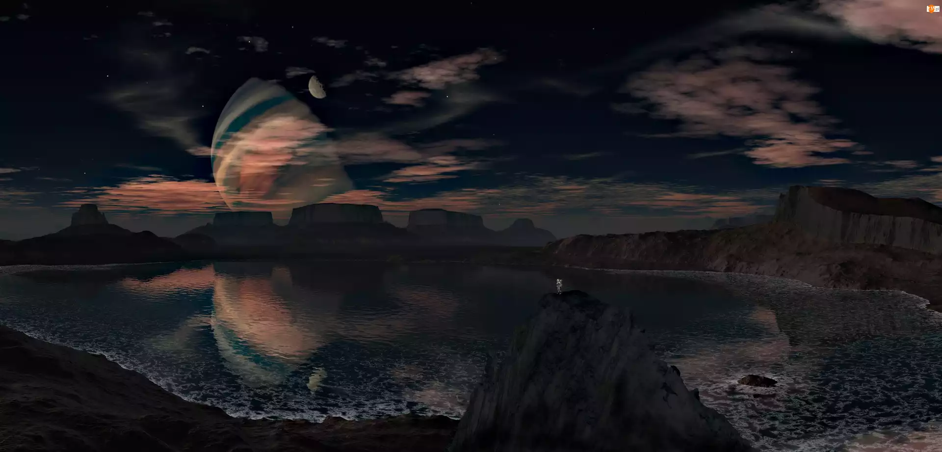 Niebo, Kosmos, Jezioro, Chmury, Planety, Astronauta, Fantasy, Góry