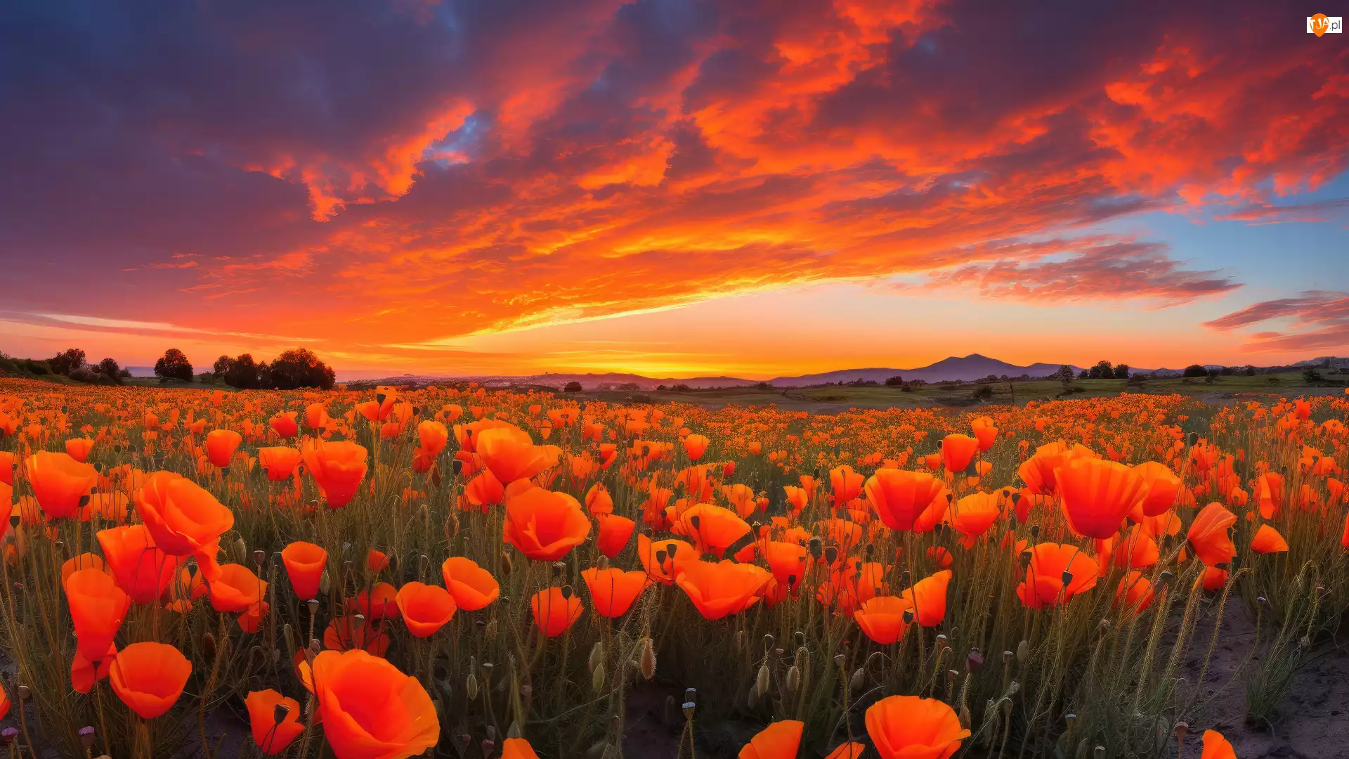 Niebo, Lato, Czerwone, Chmury, Pole, Drzewa, Zachód słońca, Maki