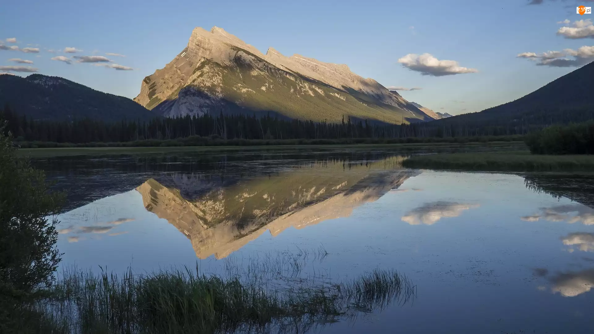 Niebo, Park Narodowy Banff, Chmury, Trawy, Alberta, Jezioro, Góry, Canadian Rockies, Wschód słońca, Vermilion Lake, Kanada, Mount Rundle, Góra