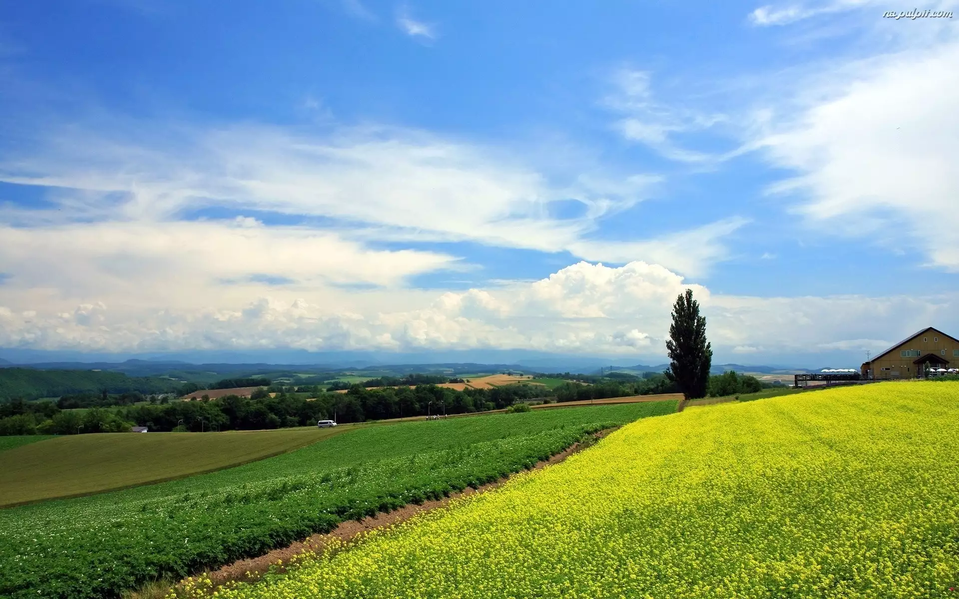 Niebo, Pole, Drzewo, Rzepak, Dom