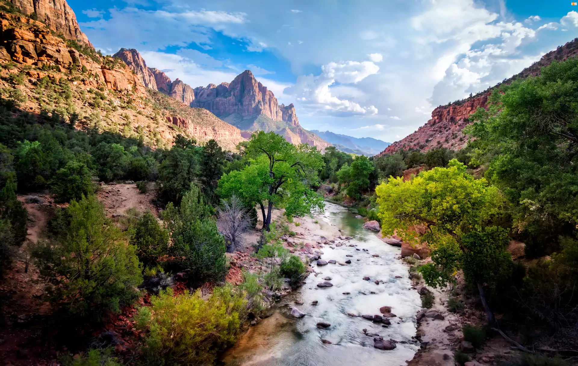Niebo, Rzeka, Góry, Kanion, Drzewa