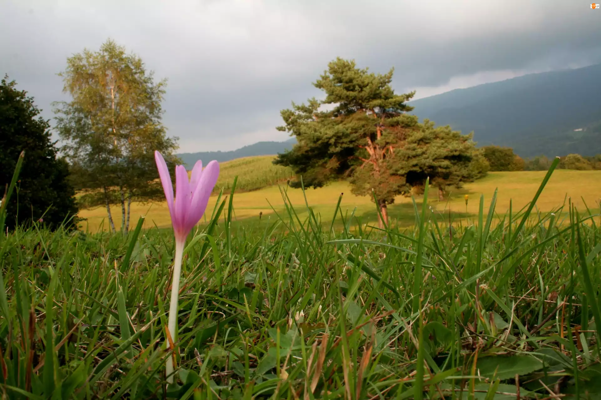 Niebo, Zimowit, Trawa, Zielona, Drzewa