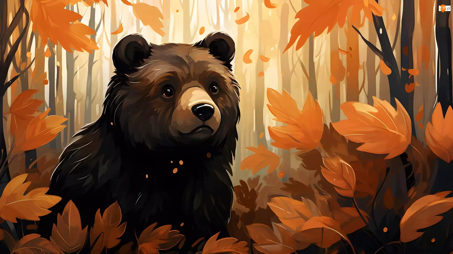 Niedźwiedź, Liście, Las, Grafika, Brązowe