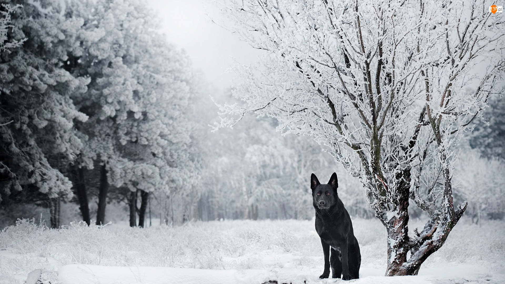 Drzewa, Pies, Czarny owczarek niemiecki, Zima