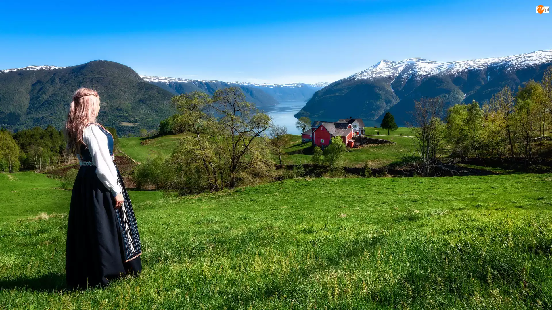 Norwegia, Regionalny, Strój, Dziewczyna, Domy, Góry, Drzewa, Wzgórza, Łąka, Sogn og Fjordane