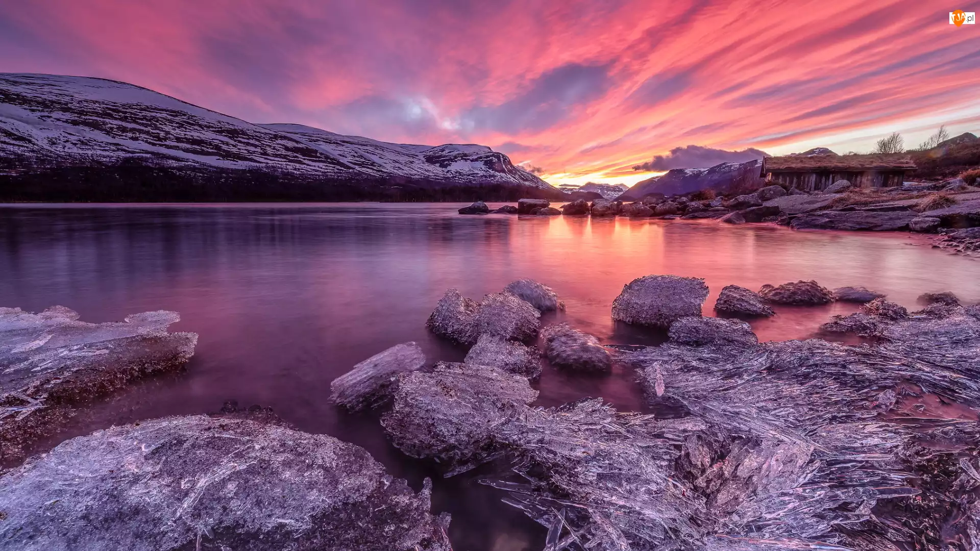 Ron, Jezioro Vasetvatnet, Kamienie, Okręg Innlandet, Wschód słońca, Góry, Norwegia, Oblodzone