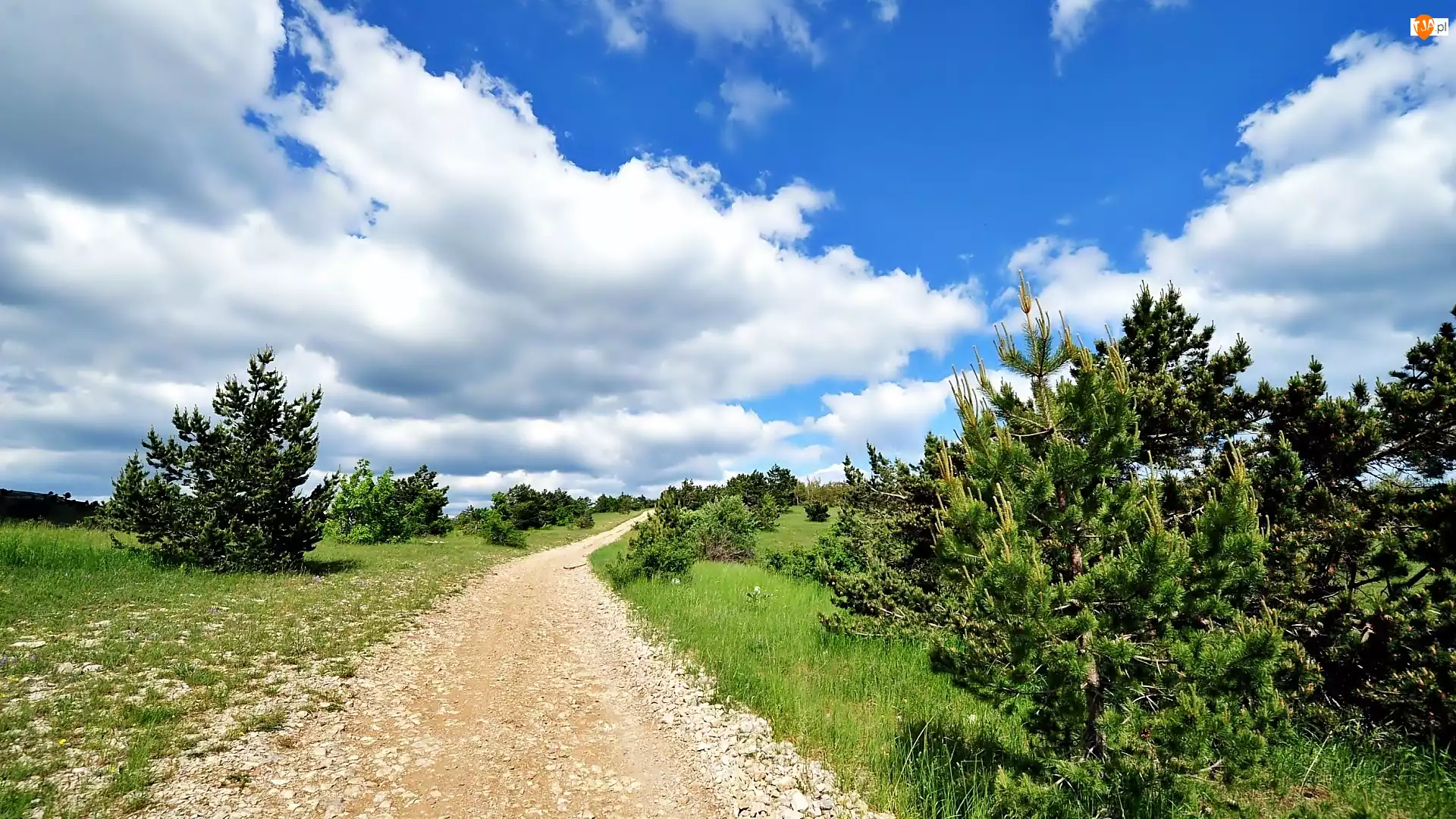 Obłoki, Droga, Roślinność, Łąka, Niebo