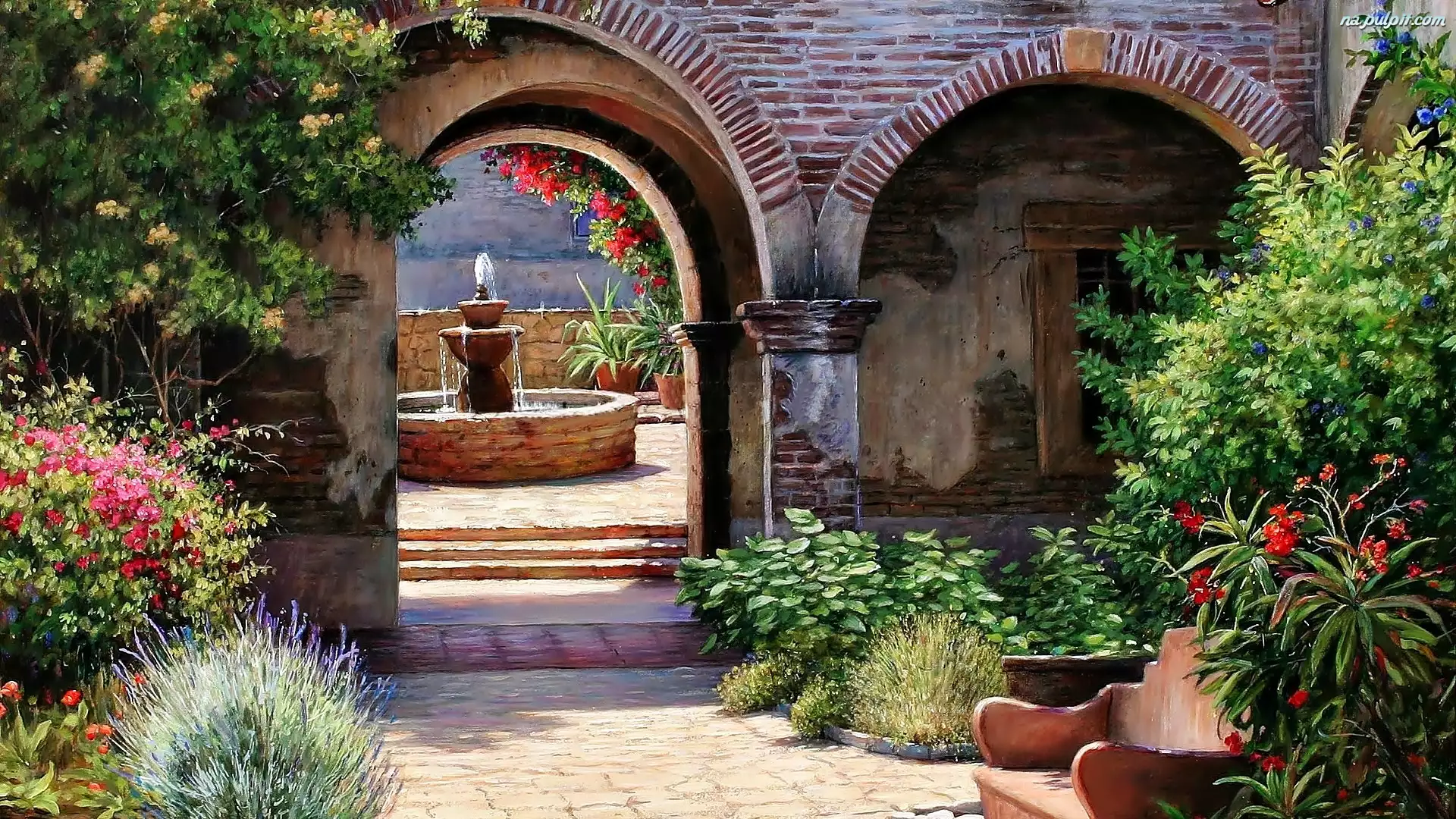 Obraz, Ogród, Fontanna, Patio, Kwiaty