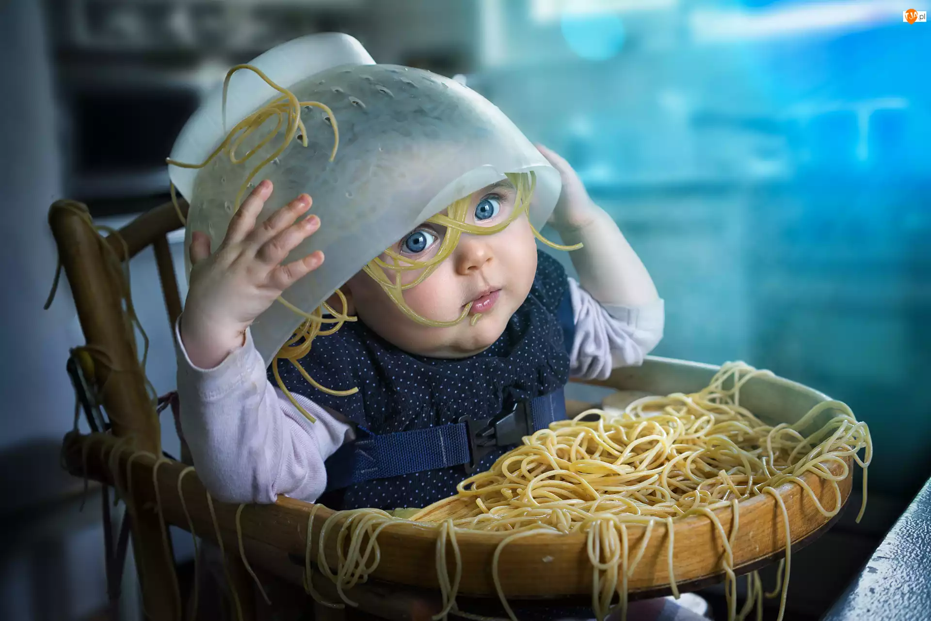Niebieskie, Dziecko, Stolik, Makaron, Oczy, Miska